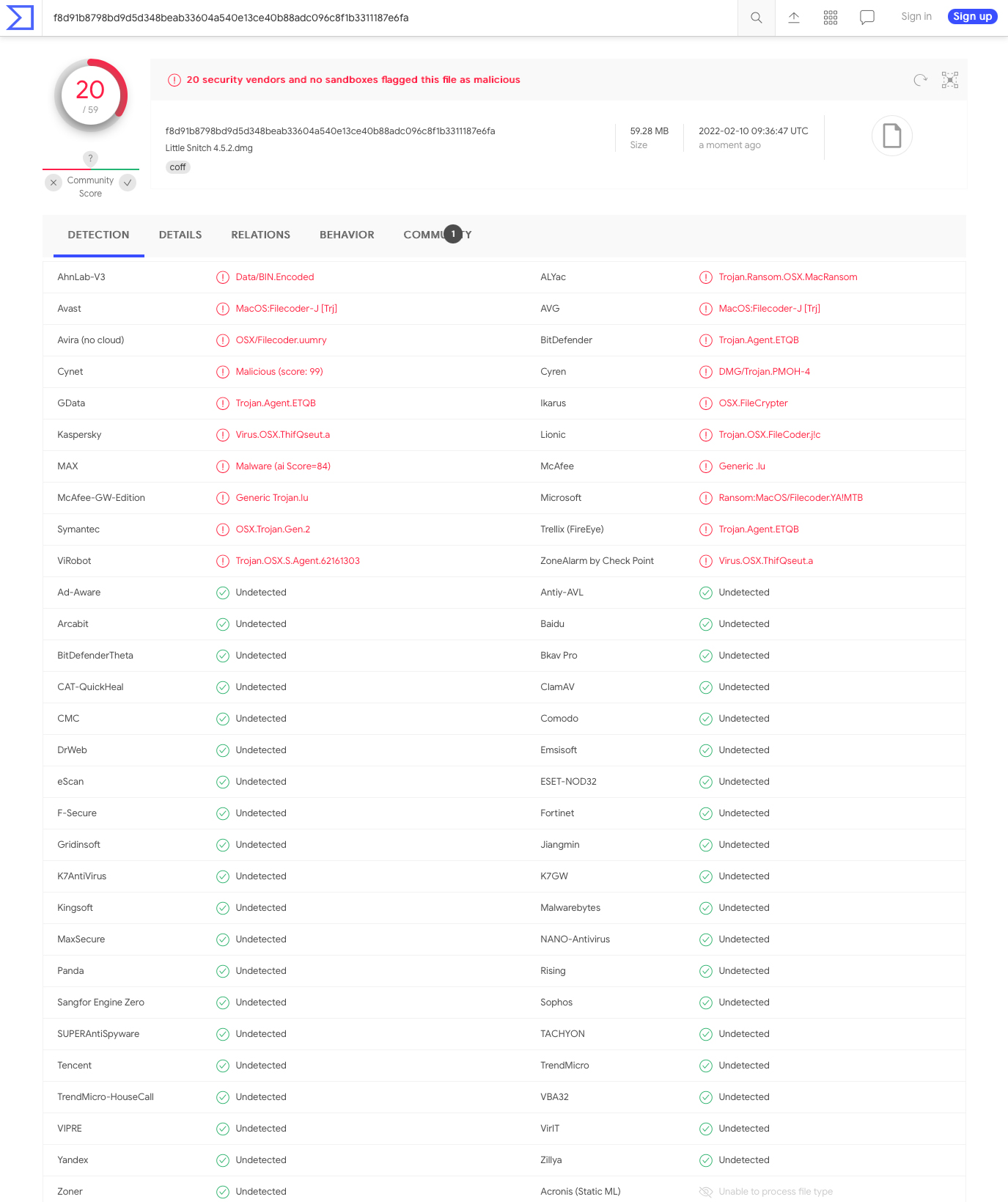 Known macOS malware from 2020, as seen by security products https://www.virustotal.com/gui/file...540e13ce40b88adc096c8f1b3311187e6fa/detection