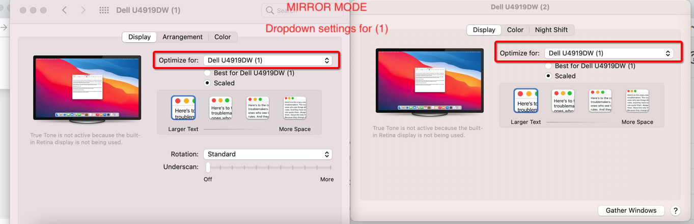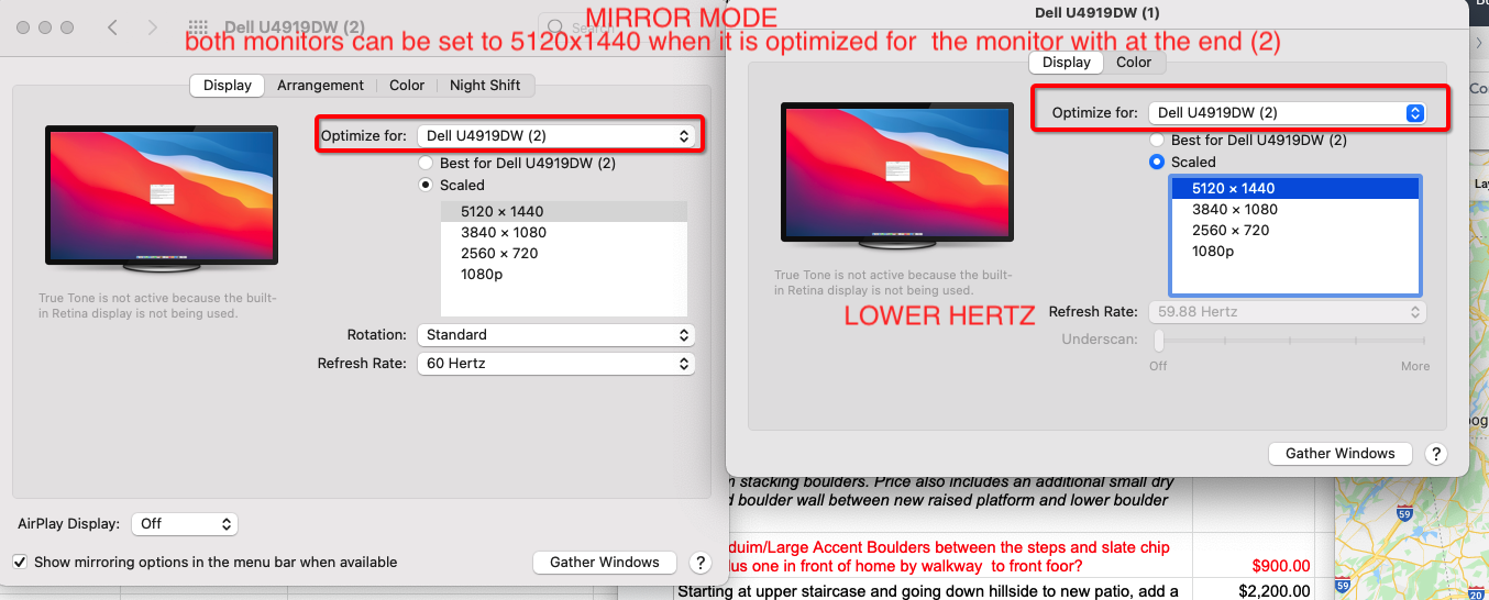 I've got two Dell U4919DW monitors hooked up using a DP 2.1 cords to a Kensington SD5500T thunderbolt 3 docking station which supports two 4K monitors at 60hz. One of the monitors is running fine at the proper resolution 5120x1440 and 60hz refresh rate. The other monitor seems to be capped by the operating system at 3840x1080. I have two of the Kensington docks and they both do the same thing with the monitors. So I don't think it's an issue with the dock. The monitors have the same settings so it's not a monitor setting. When in mirror mode on the mac, the OS allows for both screens to have 5120x1440 resolution, when you take mirror mode off the resolution on one of the two monitors gets lowered to 3840x1880. Apple support was useless and a waste of 2.5 hours. Not even going to try to call Dell on this one. See attached screenshots of the various display settings depending on mirror mode vs non mirror mode. Please let me know what you all think it could be or if it is a limitation of the graphics card.
