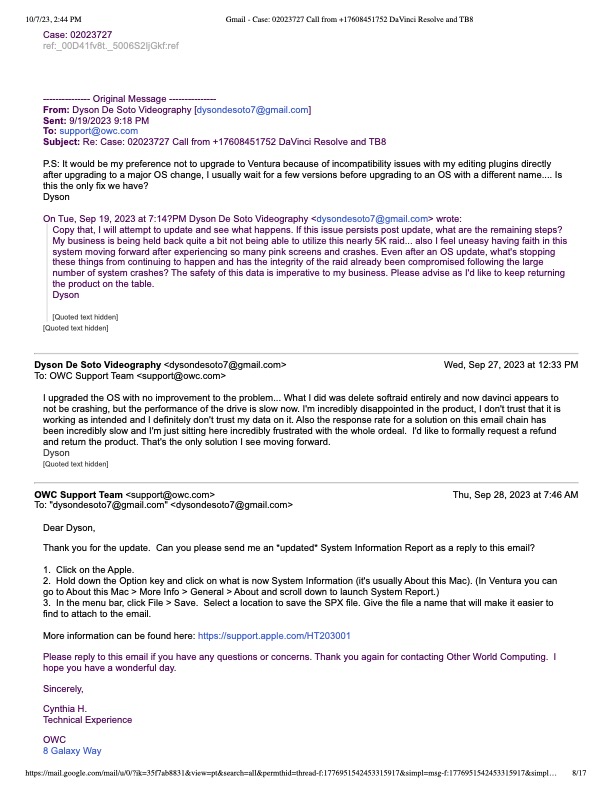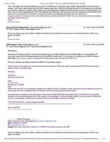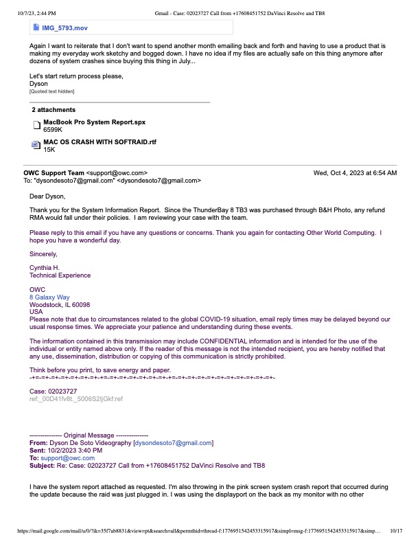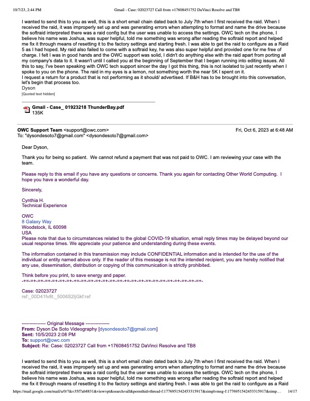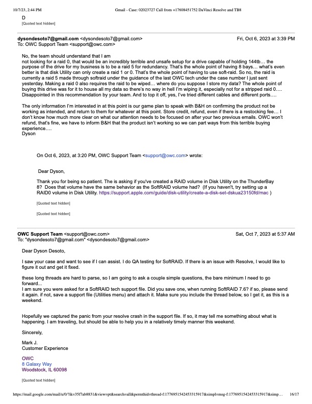 I bought the OWC ThunderBay 8 144TB 8-Bay Raid 5 array off of B&H to use as my main editing drive when editing with DaVinci Resolve. I already owned a G-Raid 8 Bay enclosure, but I wanted a second with higher storage capacity and speed. First mistake I made was failing to look closer at the OWC offerings before purchase. I didn't realize the amount of negative feedback Softraid received, not only for its technical short comings, but the fact that you had to buy it just to configure your raid if not previously set up. My raid arrived and I was super excited to get going with the product, it also claimed to be pre-configed to be raid 5, but softraid was glitching out and had every option greyed out effectively keeping me from formatting the raid with something as simple as a custom name (please see attached PDF). The pdf shows an email chain with OWC tech support conforming that softraid wasn't working as intended and we worked it out on the phone together and he even gifted me a full version of softraid on top of that. So far I felt OWC was at least making a good effort to make me feel comfortable with my purchase. Unfortunately that was the only good thing OWC did for me during this discourse.