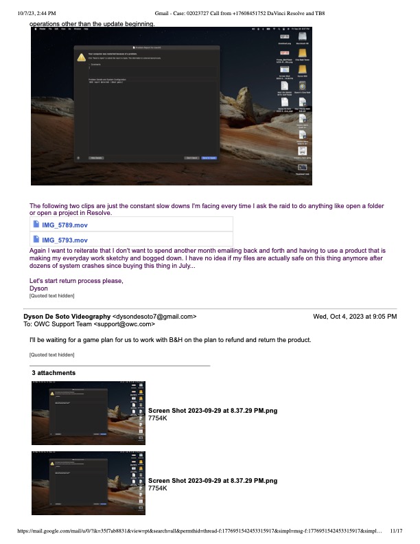 Finally I was like, I'm done, I don't want to email you ever day for the next unforeseeable months trying to solve Softraid's issues. Plus I have no idea if the raid's integrity after crashing 10 plus times through a series of testing. I just wanted to move forward with retuning the product and wiping my hands of this whole mess. They responded saying they can't refund it since B&H sold it to me. I responded saying ok lets work together to explain this to B&H because its been past 30 days and last time a product needed to be returned post 30 days, they refer you to the manufacturer. Last time, I was able to fix the issue with that manufacturer, but OWC on the other hand has kept me strung along this never ending email chain to fix what I consider to be their software issues. I feel gaslit when they say nobody has ever reported this issue. Looking at the B&H ad today, I saw someone else reviewed and mentioned the kernel panics. Second mistake was not reading the 1 star reviews...