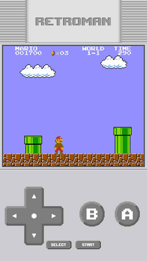 Loading games is straightforward: simply save legal NES ROM files (.nes) to your device using the iOS Files app, then open Retroman and select the game you want to play. Retroman also supports loading ROMs directly from other iOS apps using the 'Open In' feature.