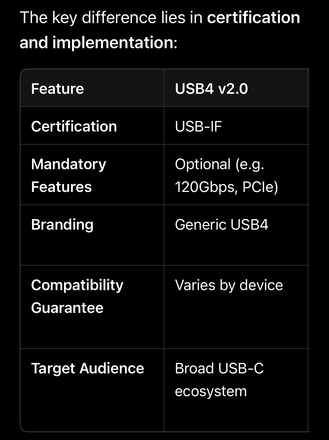 will be USB4v2 for a TB5 connection because the proocols used by TB5 are all part of USB4. My original post did go on to elaborate on TB4/5 being about certification and minimum specs.