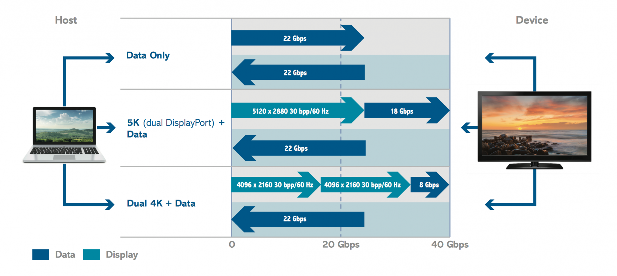 It surprises me that the bandwidth isn't common. I should've known there was a catch anyway.This is a common misconception caused by misleading marketing by Intel and Apple. Thunderbolt 3 (and 4) are actually limited to ~20Gbps for data transfer, with the remaining ~20Gbps of bandwidth always being reserved for the display streams, even with no displays connected. See the image below for the details on the bandwidth split across common use cases.