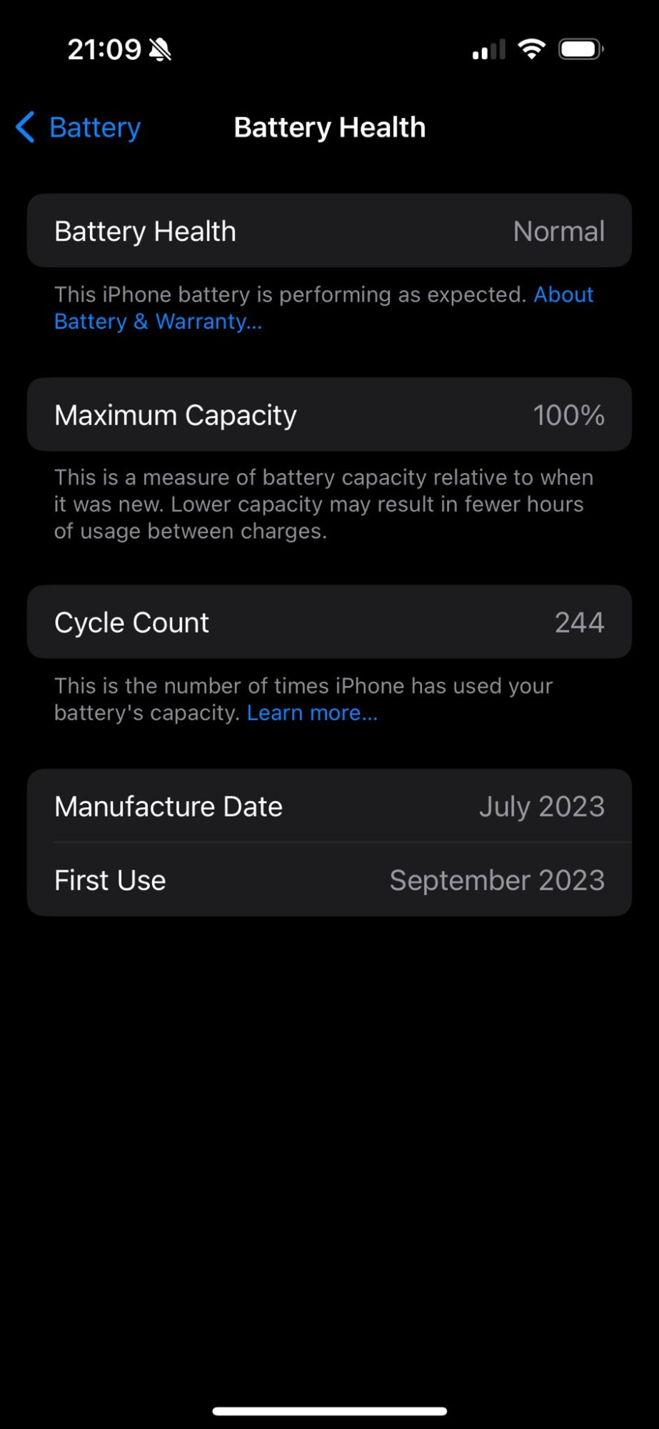 I had 100% capacity after 1 and a half years of use on iPhone 13 mini100% with 135 cycles, 80% limit enabled. iPhone 15 Pro Max, using the action button as garage door opener by Shortcuts functionality.