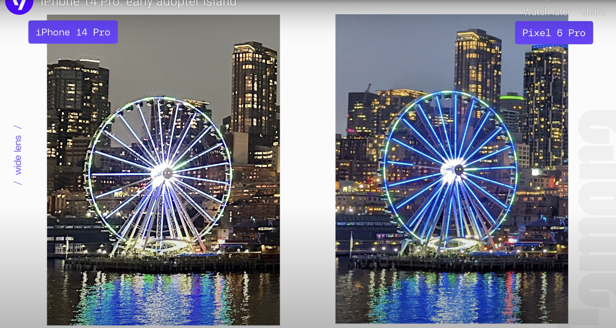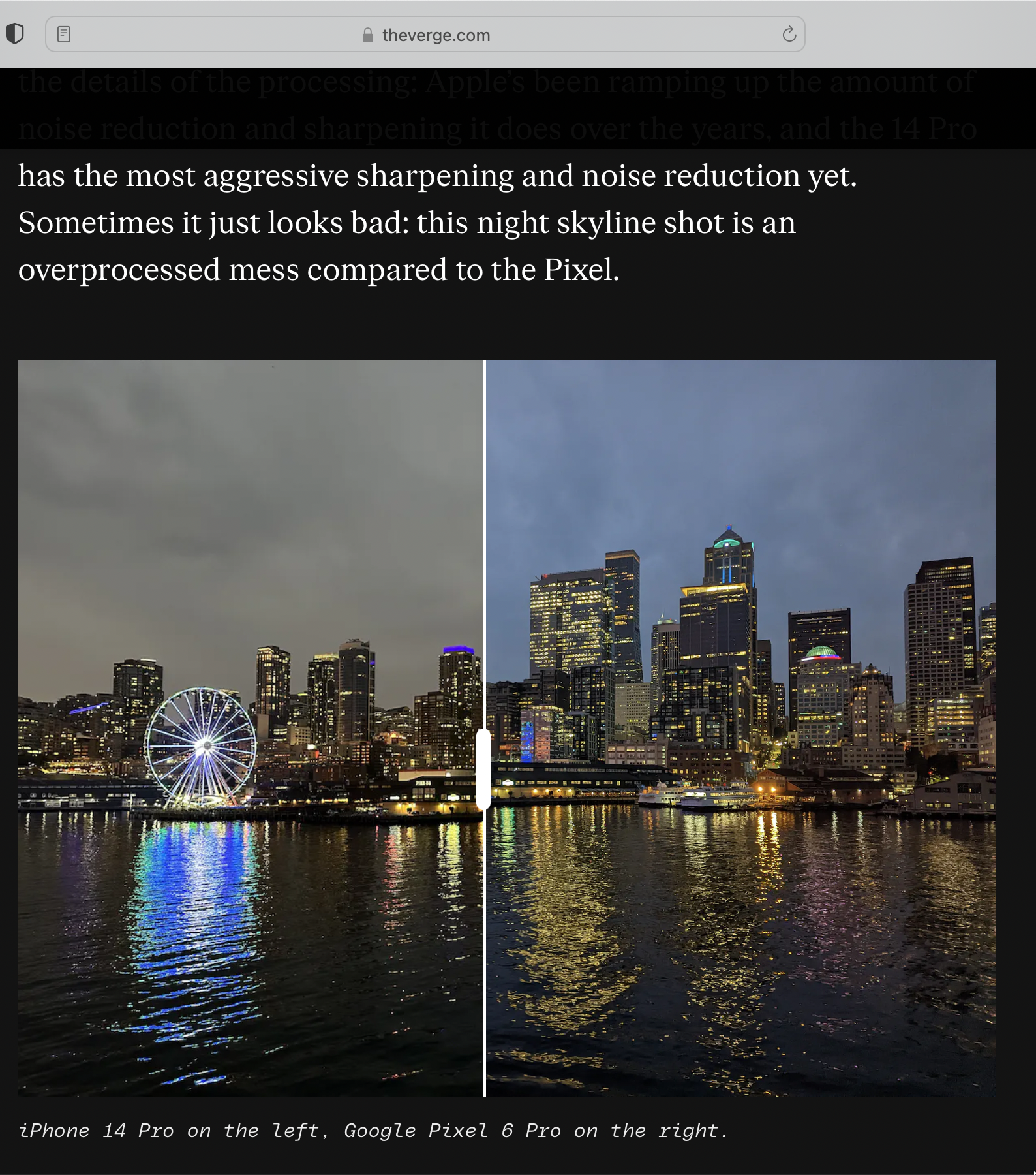 iPhone 14 Pro (below): WELCOME TO GOTHAM, everything has a sickly yellow glow to it. The sky looks like ash instead of evening clouds. The subtlety of the building colors are gone. The building windows look more like glowing yellow globs of light instead of actual windows. The Ferris wheel's blue has been completely nuked, much like the other colors in this image. Look at the domed roof on the right, overexposed and the red is completely washed out vs. the Pixel. Lest I forget is that water or is that crude oil I see? The color from the water is gone and the oversharpening is unflattering.