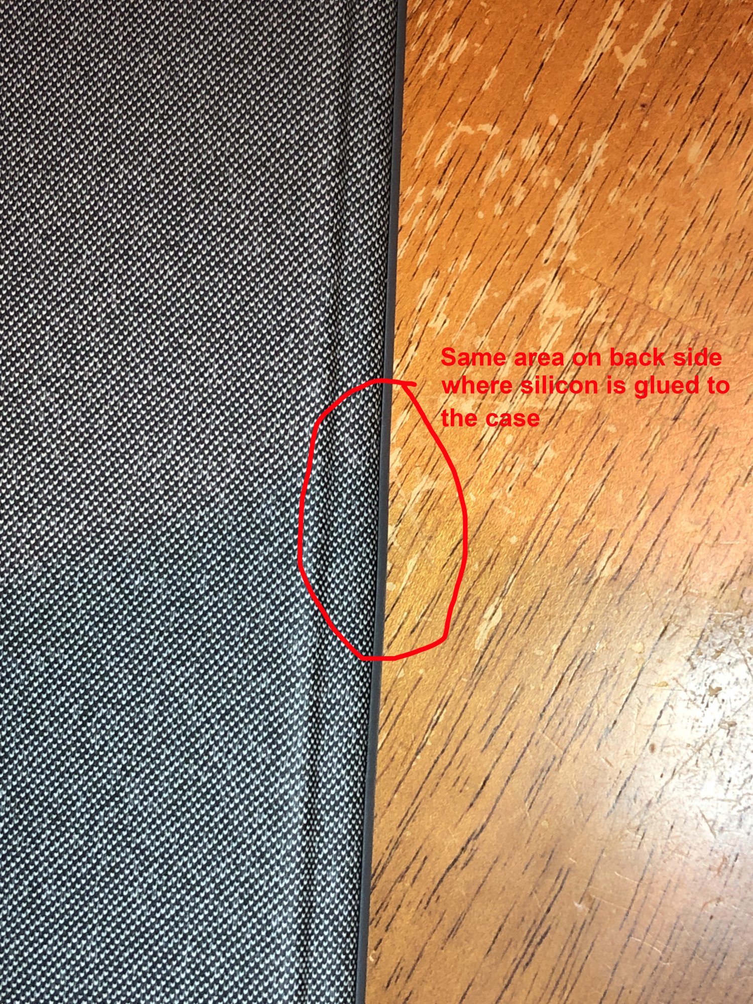 I took a close look and it is not where the silicon is attached to the case. It is very definitely the pin connector from the case where it meets the iPad not sitting flush. At least on mine. If I look on the back side where the silicon is glued to the case, there is a slight bulge but no gap like on the front where the pin connectors meet.Thanks! I also noticed that the area you circled has a "seam" where two parts of the hinge joins together and there is a tiny gap. On my case, I noticed that I am able to close this tiny gap when I press in the hinge from the side. Just wondering if yours does it too? Just wanted to make sure it's not a case where the glue on my hinge is falling apart...
