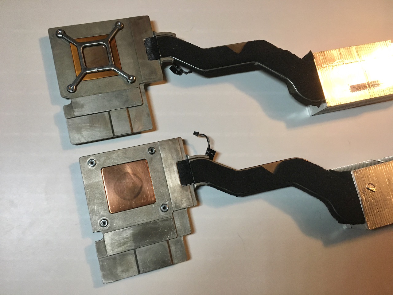 Above is Apple part 730-0573, which is a GPU heatsink for an A1255 Early 2009 24" iMac (ignore the metal brace, I just screwed that there so it didn't get lost). Below is Apple part 730-0545-A, which is *also* a GPU heatsink for an A1255 Early 2009 24" iMac. There's such little info on those part numbers that I can't tell whether the second one was for a different revision of the HD4850 or for the GT130 available in the same model.
