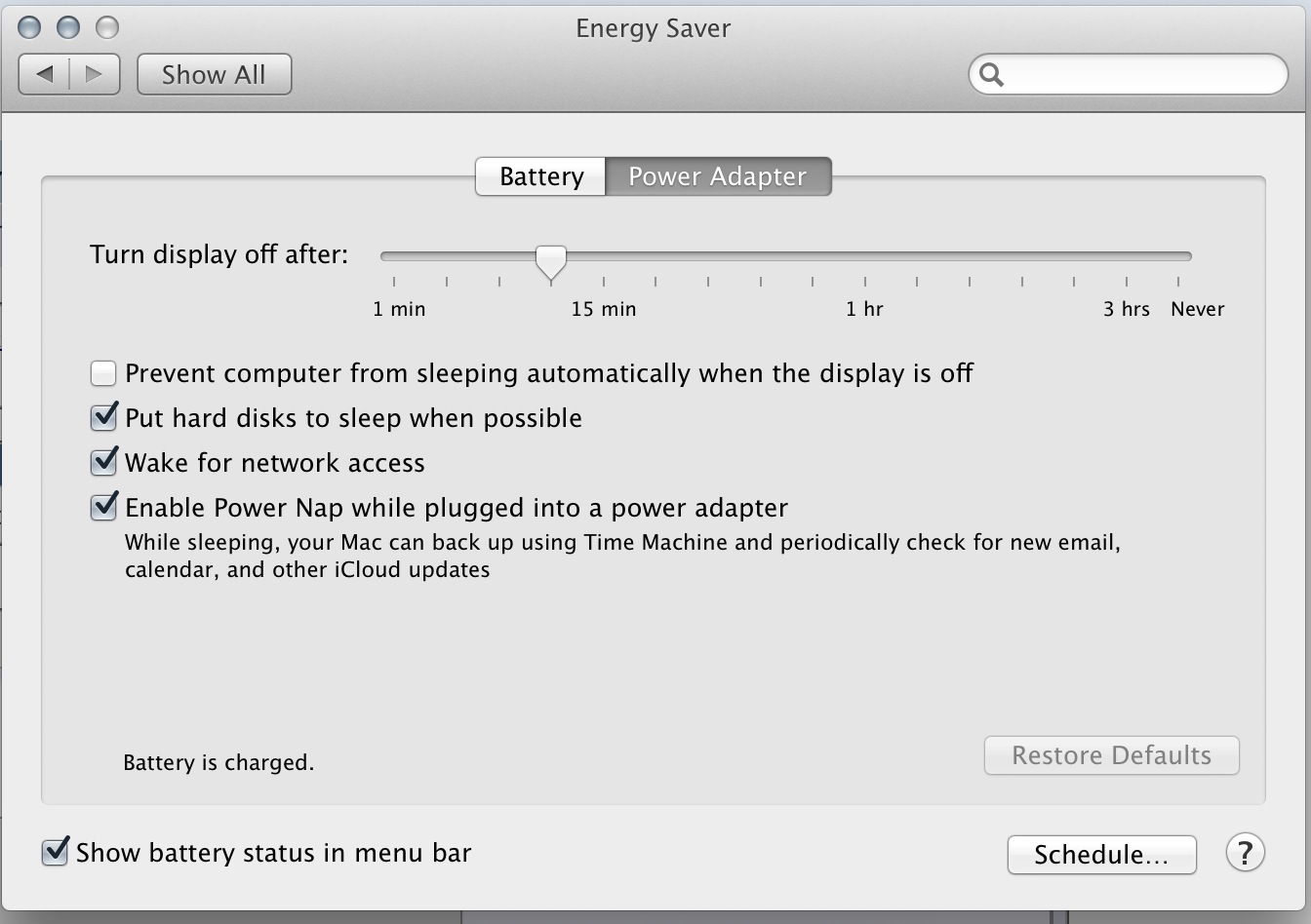 Trying to investigate and can't see the computer sleep slider in system prefs on battery or power adaptor. This is my first use of mavericks previously snow leopard is as far as I've gone - so maybe it's somewhere else?