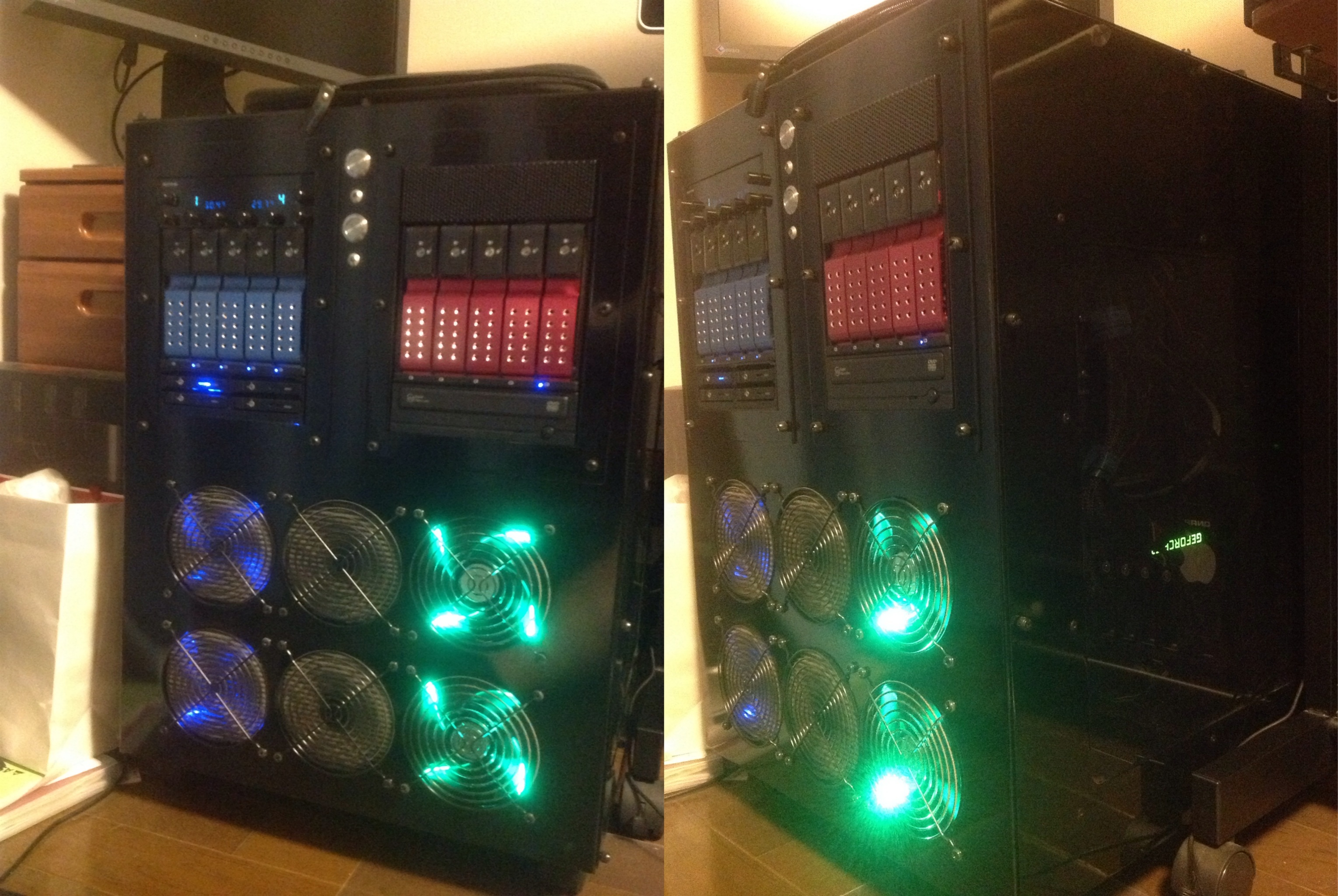 Blue side contain a Xeon with VMware, folding with an virtual Ubuntu; on the green side I have a native Ubuntu with an i7 2600S and GTX 780. I promise the green fans where in before; but they fitting well to the GTX logo inside. Was kind of happy to see that nice I fired up the GTX.