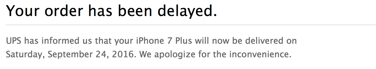 Just got an email from Apple confirming a Saturday delivery! It was the same one that went out earlier, except this time the variables have been correctly filled in. It says that delivery will now be on Saturday, September 24th, 2016. Awesome.
