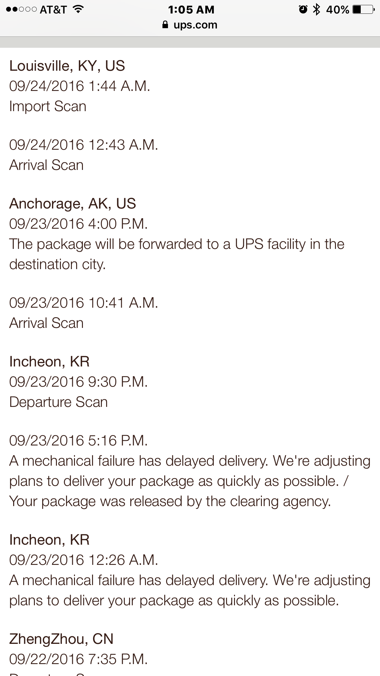 Don't use UPS Store. That'll add a day. Considering UPS CC center which is usually same day as delivery would have been but afraid to at this point too. LolStill no arrival scan in Louisville, but I got the e-mail from Apple saying Saturday. I want to reroute to a UPS store, but given all these shenanigans, I'm kinda afraid to.