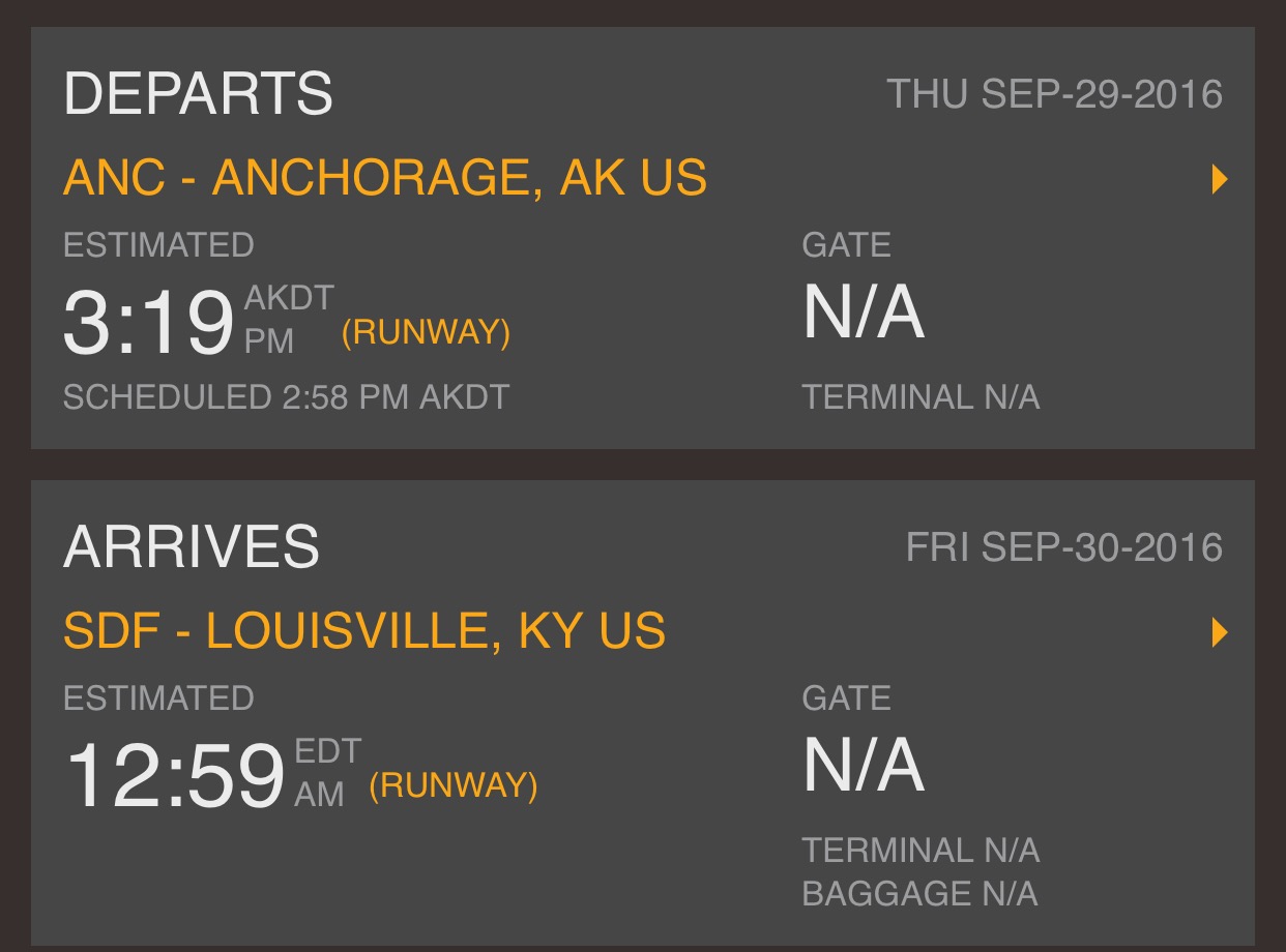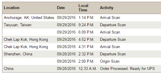 When mine was finally shipped on 9/23 (it was delivered yesterday), it didn't show a departure scan from China, only a couple arrival scans in CN. Then the night before delivery, it had an import scan in Anchorage, AK and was on its way to Los Angeles by 3am EDT (12am PDT) with a departure scan. It arrived in LA that same morning and was out for delivery by 6am PDT.Weird! I have a 7:49pm departure from Hong Kong, but no arrival scan in Korea yet. Or, will it go straight to Alaska?