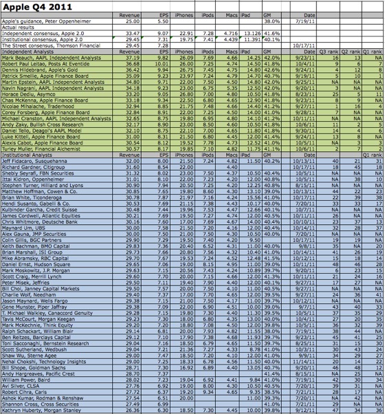 Philip Elmer-Dewitt has put together his list of analyst expectations ahead of Apple's quarterly earnings report this afternoon. The list includes estimates from 16 "independent" analysts and 42 "affiliated" analysts who work for large investment houses or research organizations.