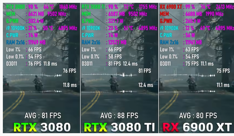 I wouldn't quantify it as poor, it seems like the 6900 is in a virtual tie with the 3080 (no-Ti) for many of the games listed, i.e., RDRII, Flight Sim and even Cyberpunk.I wonder why the 6900 does so poorly in days gone compared to the other games in the clip.