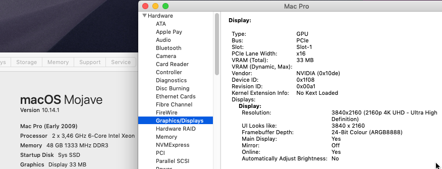 Currently there's no driver support in Mojave, so the card is listed as a 22MB Video Adapter. But I get the full 2560x1440 resolution on my monitor.