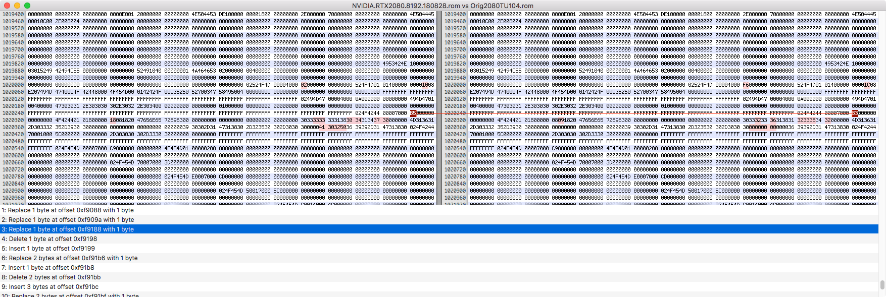 Hexfiend 2.9, I love it.What app are you using to compare the binary files? Love how it even takes into consideration offsets/inserts.