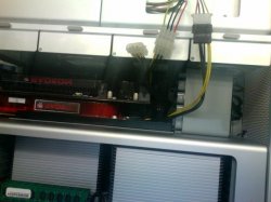 There is a trick to achieving this however. You cannot route the power strictly from the optical drive, you must take a 6pin from the original Apple Radeon card, and hook it into your second graphic cards 6 pin port, and leave the other one in its original state (in the orig apple card) then route the optical drive from molex to 1 6pin and 1 8pin converter (for my X2, other cards will just need 2 6 pins) and hok the 6 pin to the apple card and the 8 pin to the second video card. the cableling will have to be exact, if not the second graphics card will yield a red light and will not be supplied the proper power. (I did this configuration in the past without switching up the original 6 pins that came with the mac pro and found that my computer would shut down abruptly after 5-10 minutes of intensive use)