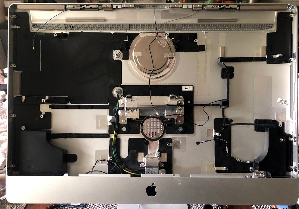 Do you mean this one? the vent right below the stand-thing?If the grille under the stand of an iMac is meant to vent heat, then maybe some means of positioning a smaller fan over it to make it an active vent might help. Again, a 12v fan run at 5v would be quiet, but might have a reasonable effect?