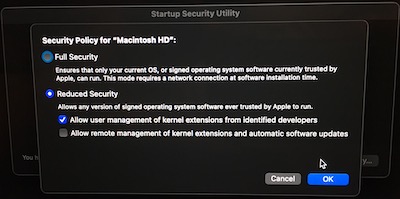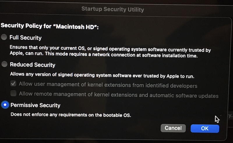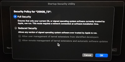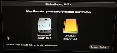 SIP is currently enabled on my internal drive. I connected a Samsung T3 external SSD and partitioned it with Disk Utility as an APFS volume. I shut down and entered recovery. The new disk did not show on the Startup Security Utility. So I thought, "probably needs an OS installed". Since I was already in Recovery, I had these options: