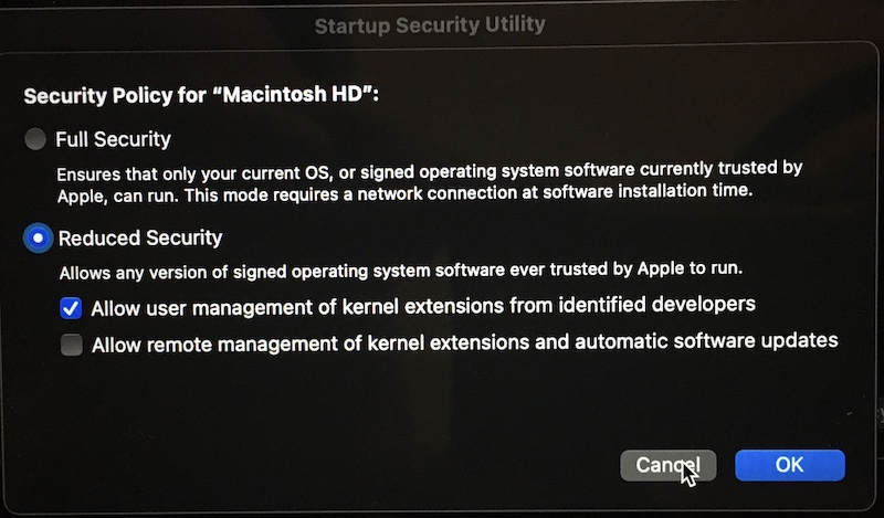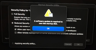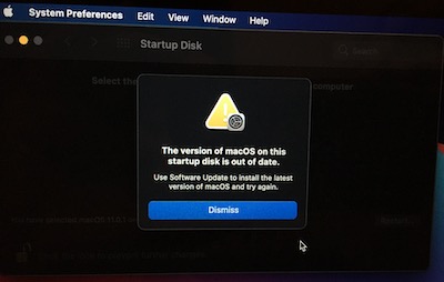 So then I decided to reboot and attempt to use System Preferences -> Startup Disk to boot off the external. I'm curious at this point if the new installation will even work. This is what happened: