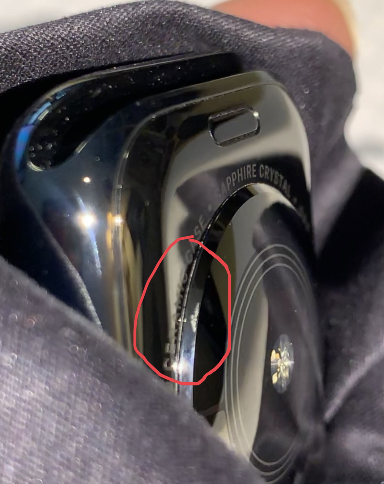 All of my regular watches on bracelets develop, over time, a series of small scratches, at what looks like a similar angle to where your chip seems to be. About 6 or 7 years ago I lost my 26 year old, very beat up, gold wedding ring. I decided to replace it with something more durable: tungsten steel. I noticed my watch case backs getting more significant and deeper scratches. I'm always careful now when putting on watches to avoid the ring.