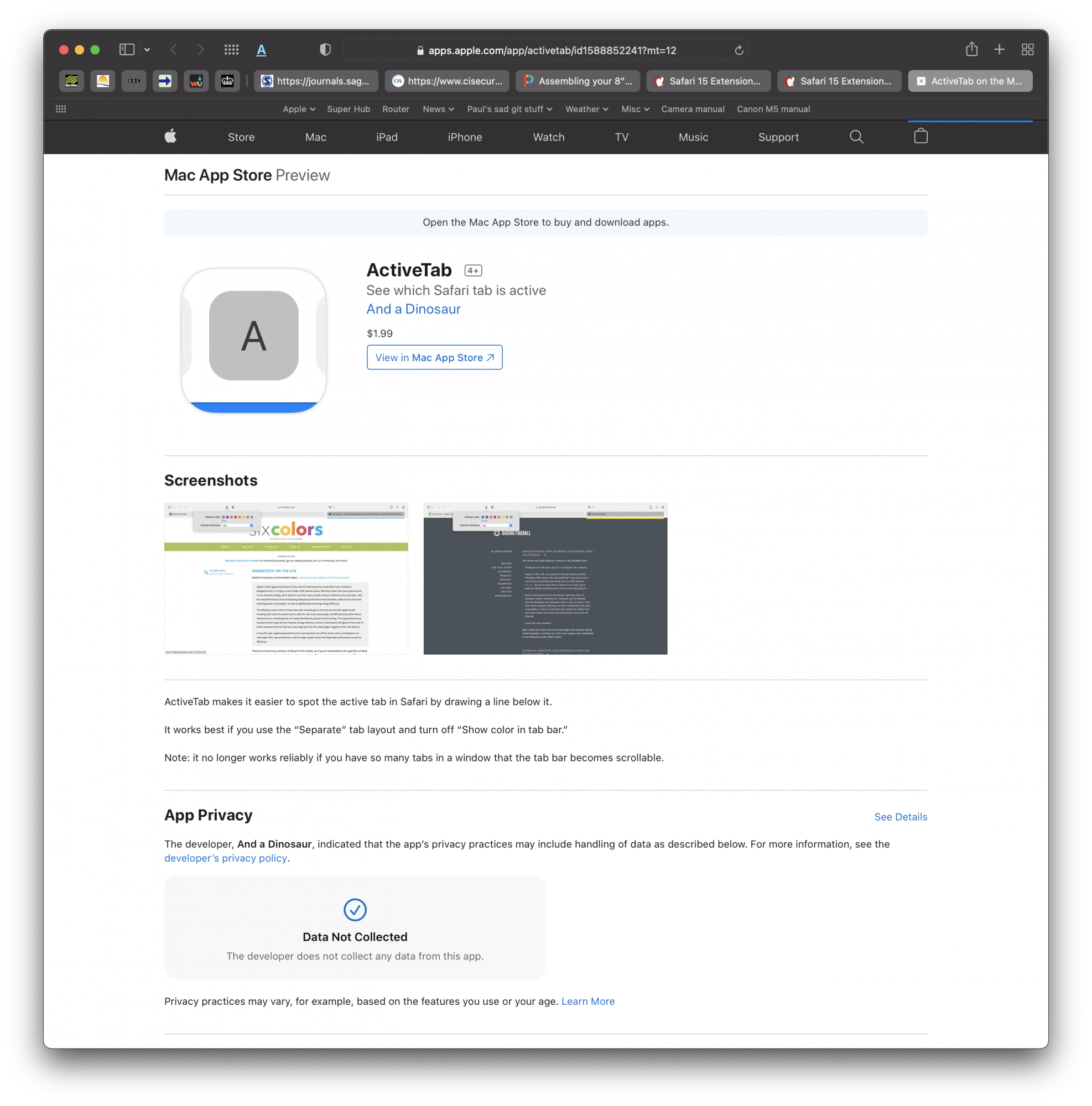 How is this better? The original beta did have the color too close to easily identify the active tab. The current tab coloring is quite easy to identify. Adding a colored bar under teh already identifiable tab is not really helpful - especially if it causes Safari stability issues.ActiveTab simply makes it easier to spot the active tab in Safari on Mac by drawing a line underneath it. There are eight colors to choose from, and the line below the tab can be customized to be between 1 and 7 pixels wide.