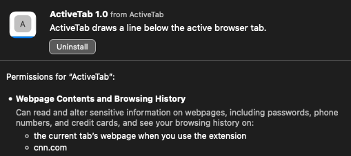 As Zhenyi notes, the extension works best with the "Separate" tab layout selected and "Show color in tab bar" disabled in the Tab section of Safari's Preferences. Zhenyi also cautions that ActiveTab will not work reliably if you have so many tabs in a window that the tab bar becomes scrollable.