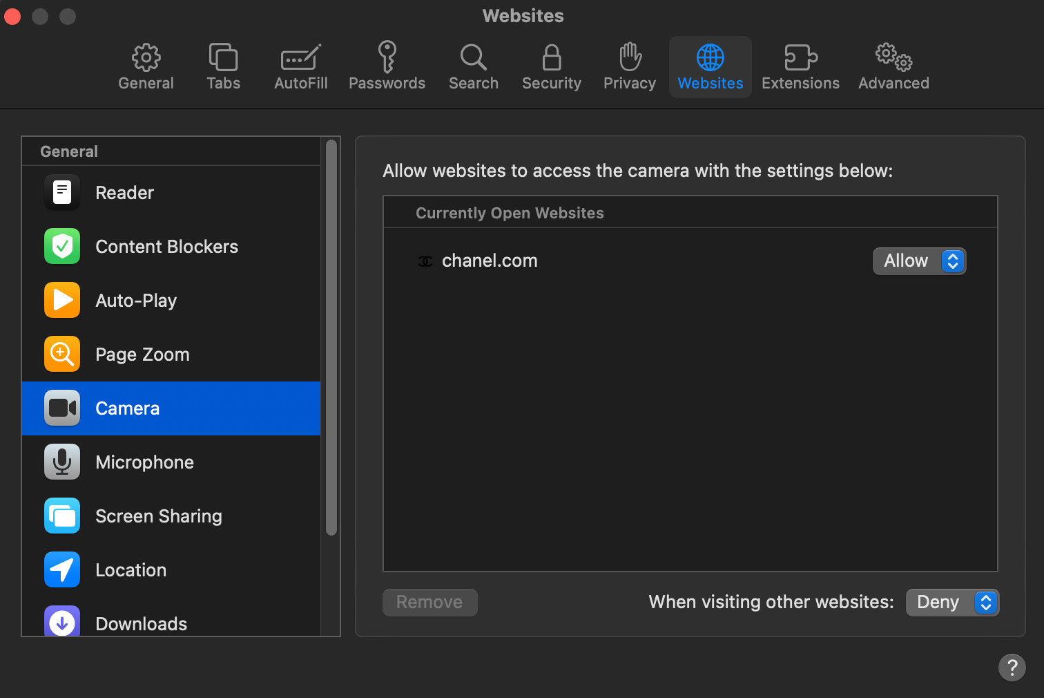 Make sure you have allowed chanel.com in Safari – Preferences – Websites – Camera.
