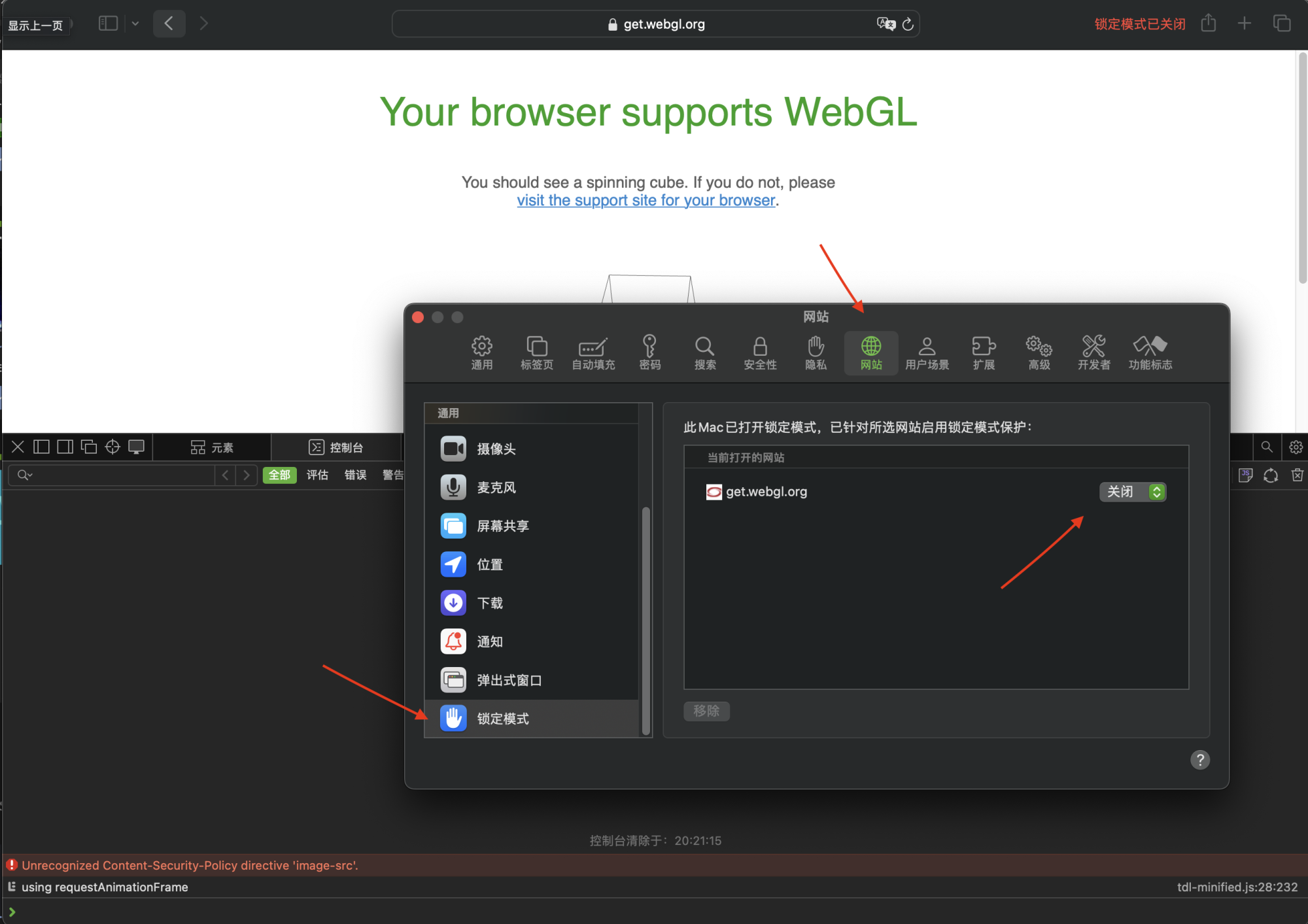 Thank you, this is is a very late response but I don't have the "palm" privacy icon on the Website tab. So still not working!I also encountered the same problem, but luckily I just found the answer to the problem. The method is to turn off the lock mode of the corresponding website in Safari, and you can use webgl normally.