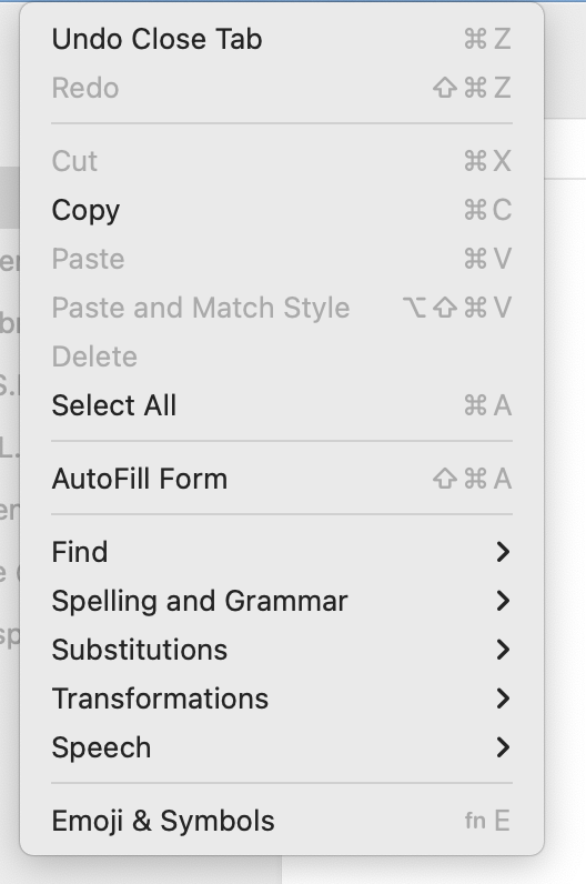 I've noticed that I can no longer use Command-C to copy text on a webpage. Instead, I have to go to the menu to do it. You can see that option is greyed out in the screen shot. Anyone know how to resolve this?