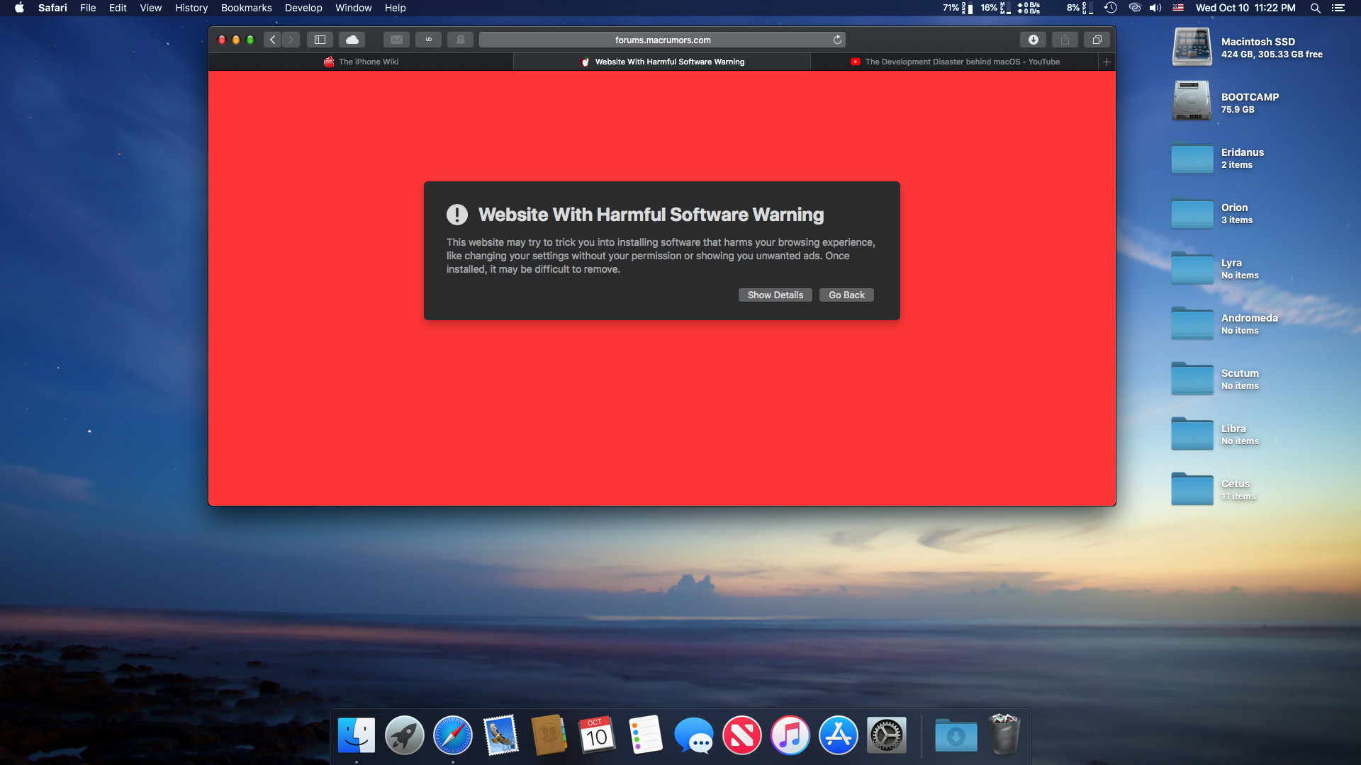 StellarVixen said: When opening a particular thread. The thread in question is "Mac OS Mojave On Unsupported Macs". Dunno why. Tried to go back and try again, same. View attachment 793864 Click to expand... Can you give me a link to specific page that’s triggering it? arn