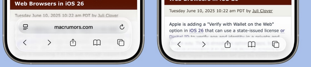 I’m sure they disappear then, similar to how they do now. What I meant was that there is little benefit in the new controls not filling the whole width anymore, and providing a glimpse of the content beneath them to the left and right and via transparency, because most of that content still remains obstructed. So you still have to make the controls disappear to really see that content.Well said, 100% agree. Presumably the controls still collapse/disappear when you scroll down the same way they do now, though? So they shouldn’t obstruct any more content?