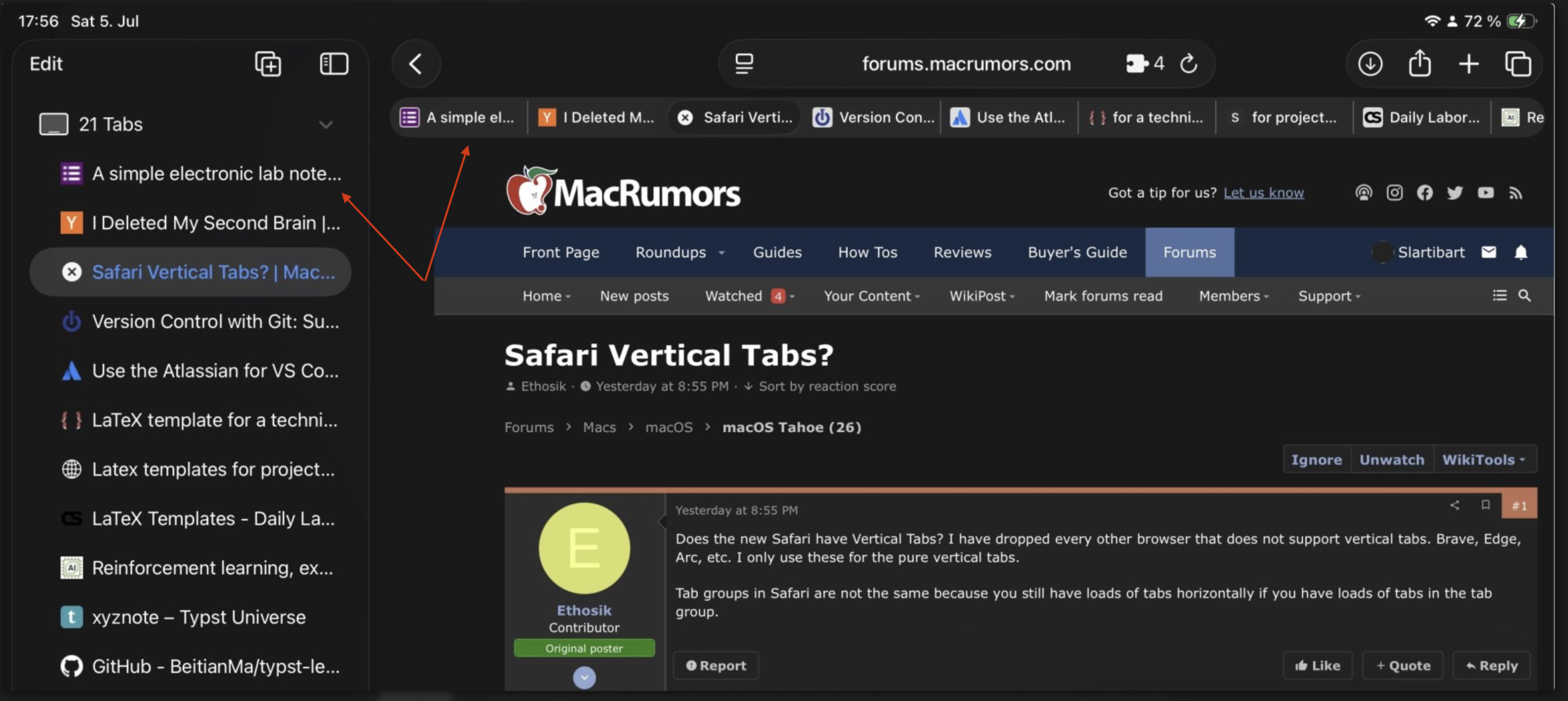 Does the new Safari have Vertical Tabs? I have dropped every other browser that does not support vertical tabs. Brave, Edge, Arc, etc. I only use these for the pure vertical tabs.