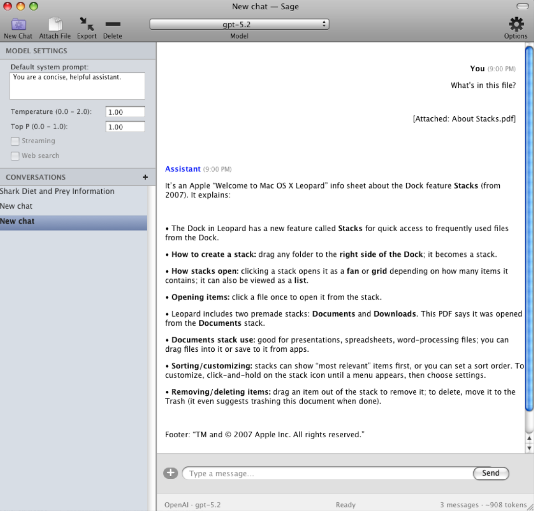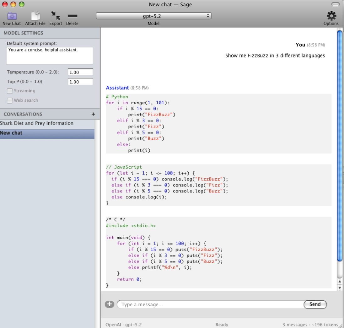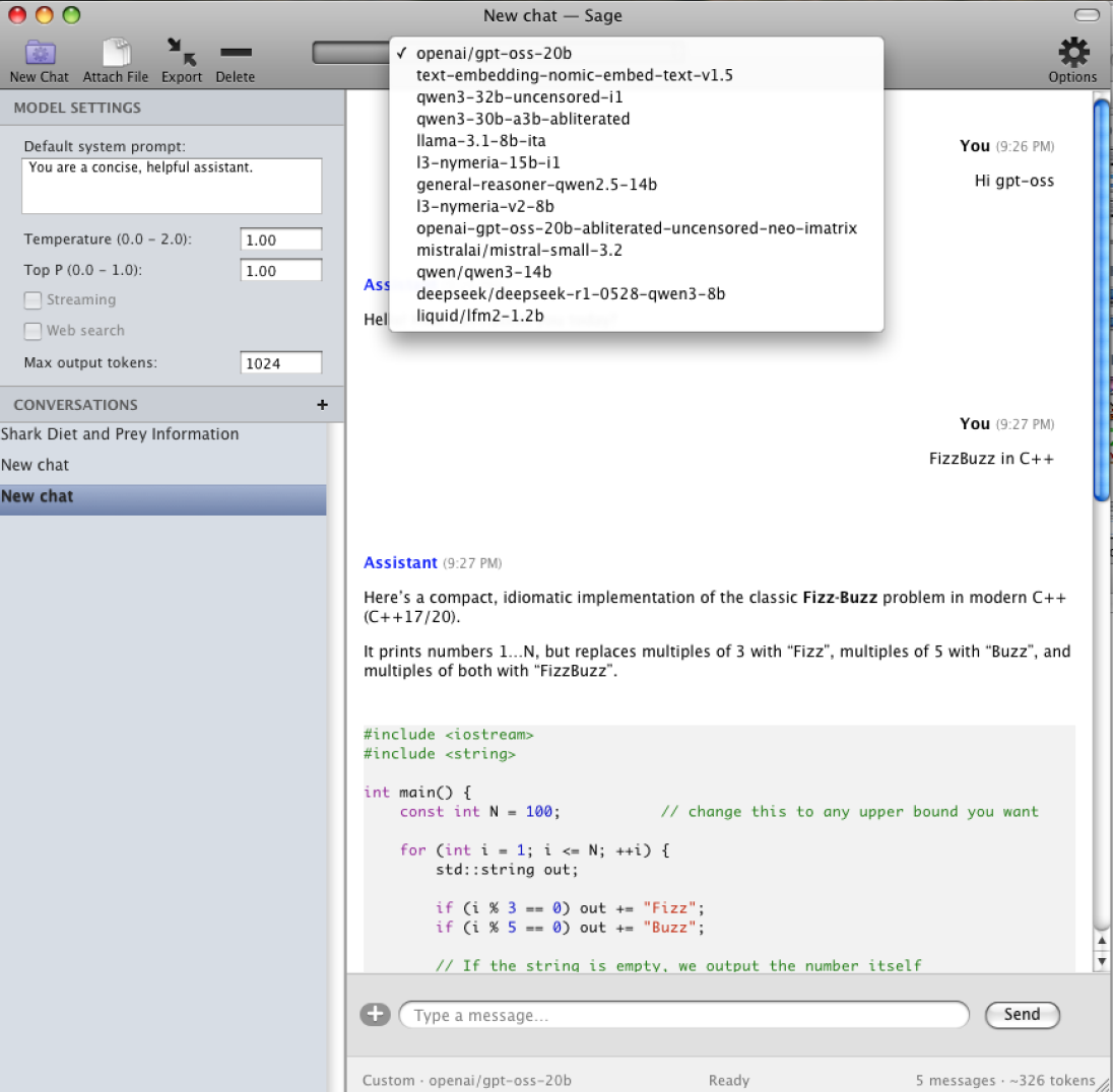 I built Sage after being underwhelmed with some of the other AI frontends for PPC Mac, gating features behind paywalls, etc. Sage has provided a huge usability boost to my PowerPC Macs and closes a big part of the web browsing gap - I've used it for fetching recipes, editing code, as a general copilot when installing and using other applications, for generating icon images.. there are a lot of great use cases out there. Since it has the ability to run local models, I've mostly switched away from using APIs, so my main PC's GPU is subsidizing most of my requests. It works quite well using any of the available API providers however and in my testing most models are fairly cheap to use for basic tasks ($0.02-0.20 USD per query, model dependent).