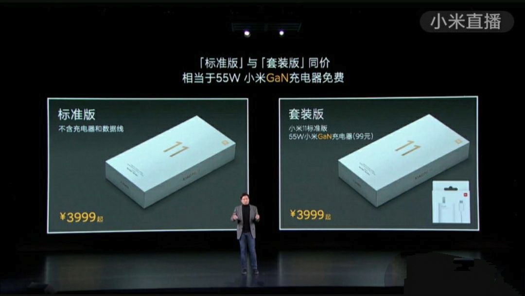 I don't know if this has been updated, Xiaomi actually set the same price, 3999RMB, on both the standard version of Mi11 (shown on the left), and the package version, which is the same standard version packaging + a separate charger (worth 99RMB when sold separately, shown on the right).