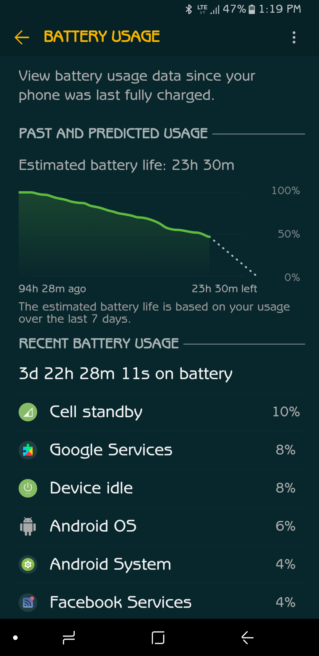 So far, 1 day, 16hrs at 82% battery 13 minutes screen time. Chart shows 41 hrs left but it's shown about 43-45 hrs left since the start. As I said, I'm seeing how long the standby can go with very little usage, I have my Note 8 and several other phones I'm using this week.