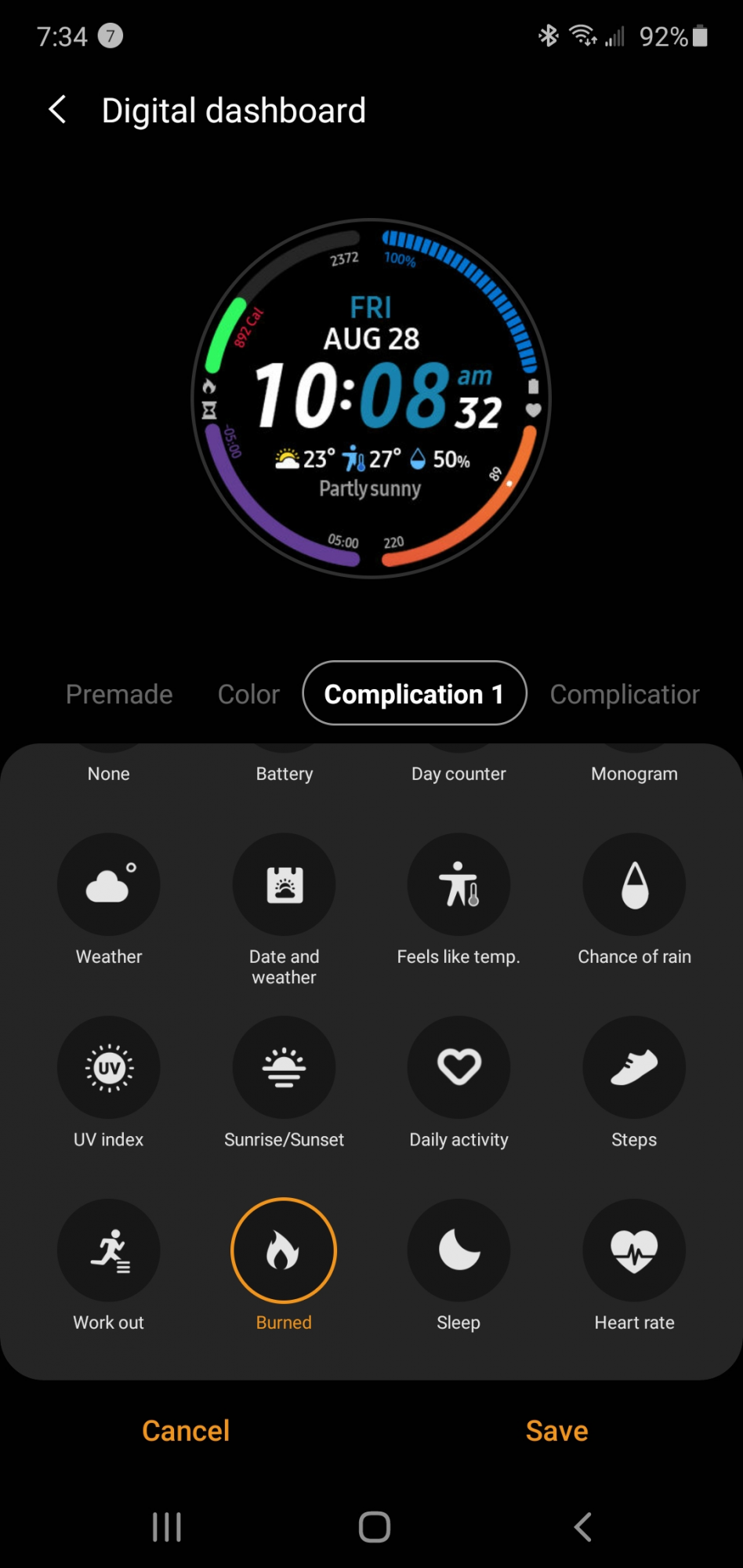 Now I have Galaxy Watch3 and finally have many more customizations. Each quadrant of the outlying circle can be set to a complication now. I have calories burned in the top left, battery top right, heart rate bottom right, and timer bottom left. The center portion showing temperature and rain chances is also customizable. And each section is a button that will take you to that related app, although the quadrants are little difficult to toggle.