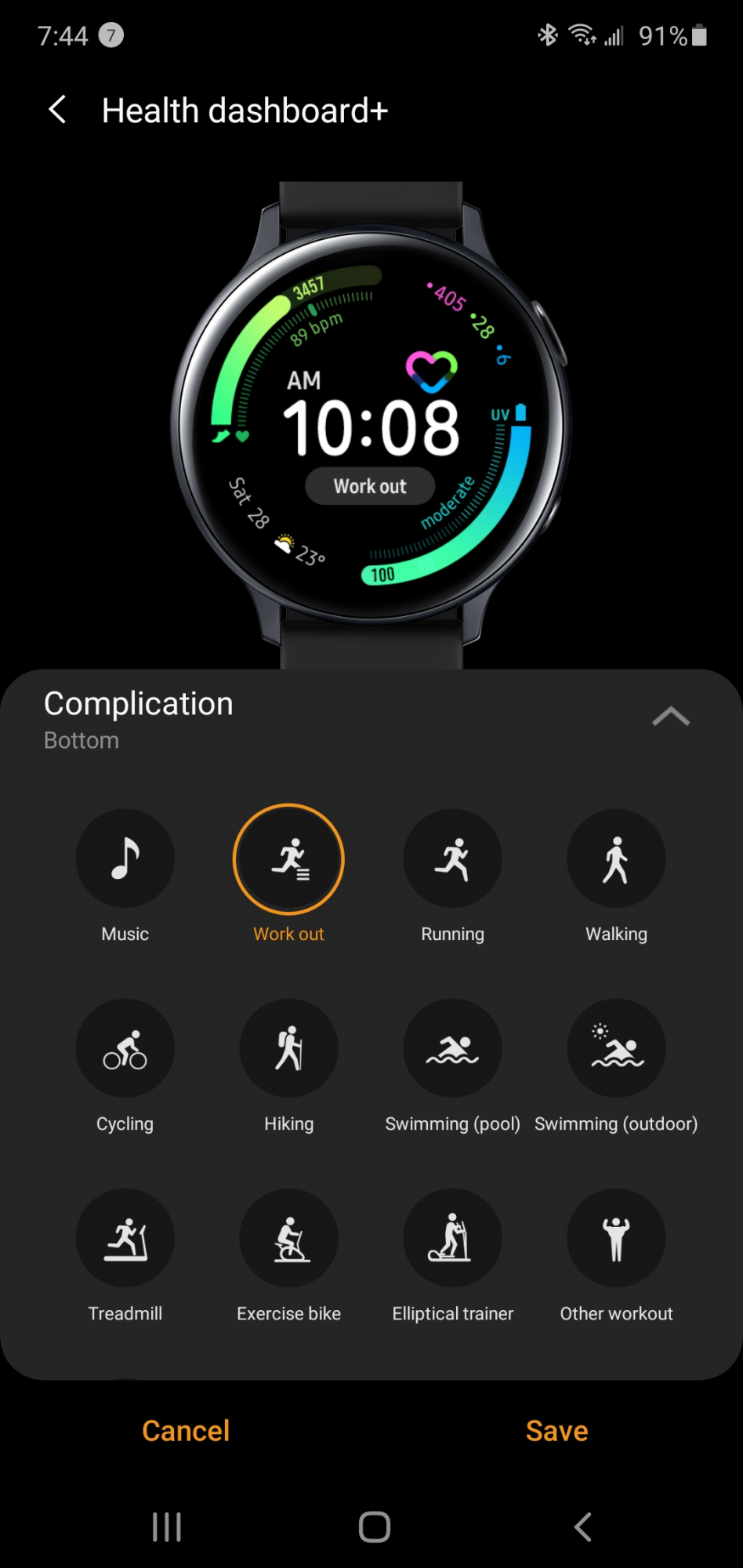 So my biggest complaint about Galaxy Watch Active2 was the lack of customization on the watch face. Most of the watch faces are completely static except for some that allow for a single complication to be shown. For example, below I have my Active2 face with the workout app designated in that center space. Other than that, I can change the colors a little and that is it. Very limiting.