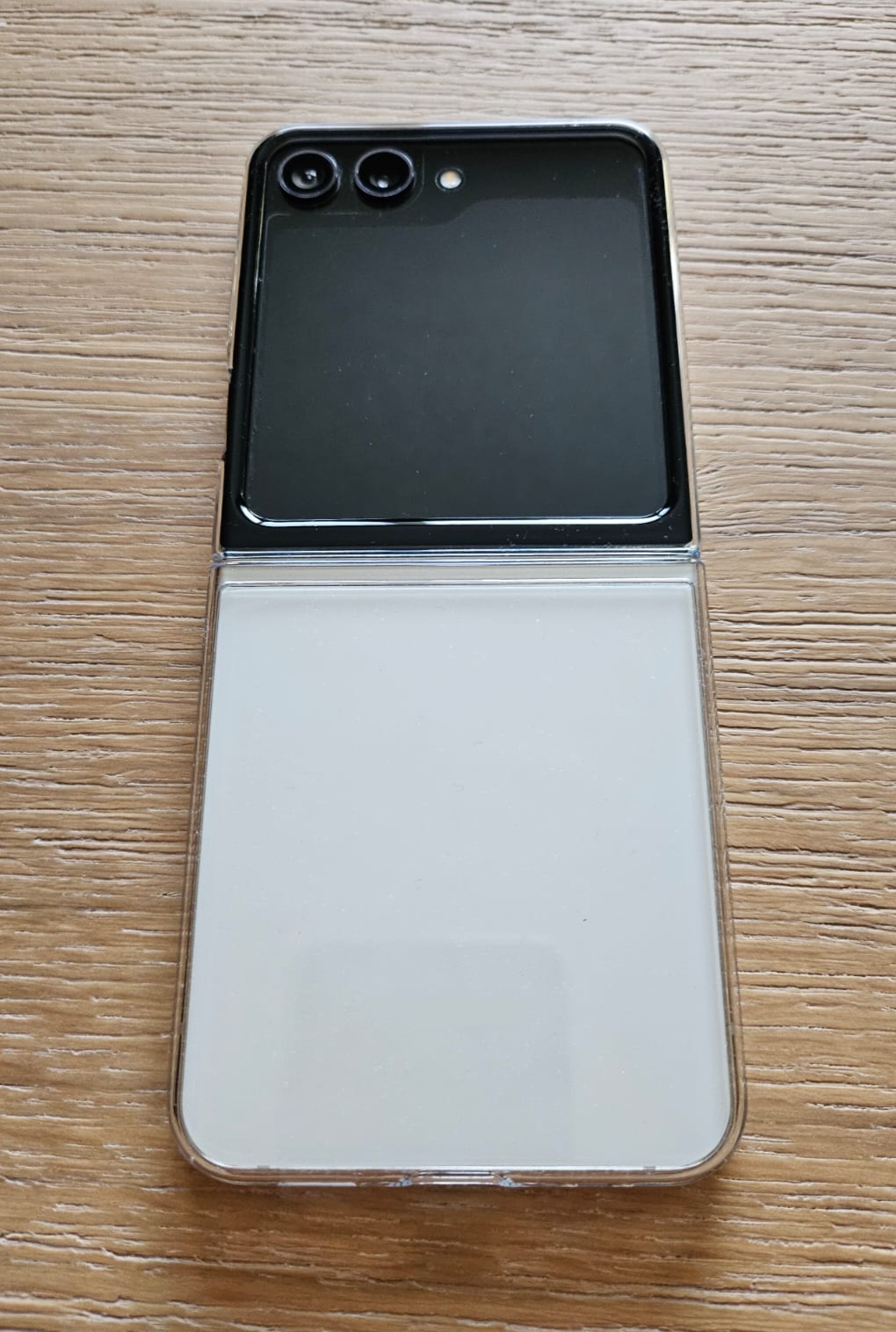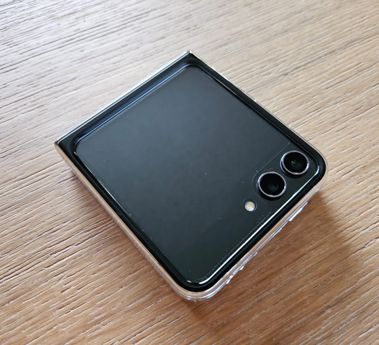 So I now have my Samsung Flipsuit case. As I mentioned previously, having no case is best, but if you need a slim case, I think Samsung's slim case is better than the third party cases out there. Third party cases all have that folder shape cut out, which I think takes away from the blacked out all screen look of the Flip5. So what Samsung did was make the top part of the case, all open, and then blacked out the edges so that the front of the phone retains the blacked out all screen look.