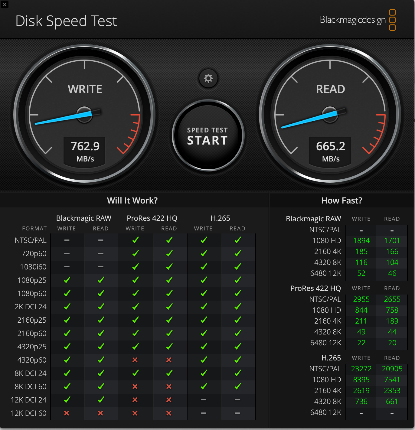 700MB/s max on write and 200 or so on read with Black magic design speed test.