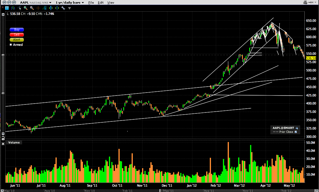 I cited specific support levels. One, the top of a channel at 485 that has years of duration, and one a rather large price gap at 425. We already broke below a rising trend line off the bottom of the channel test this week. There is another moderate rising trend it is approaching now and if it breaks below that the channel top is the likely strong support point. 485. This is all technical pricing talk. Nothing to do with fundamentals, product release cycles, and such "mundane facts".it would brake some major support levels