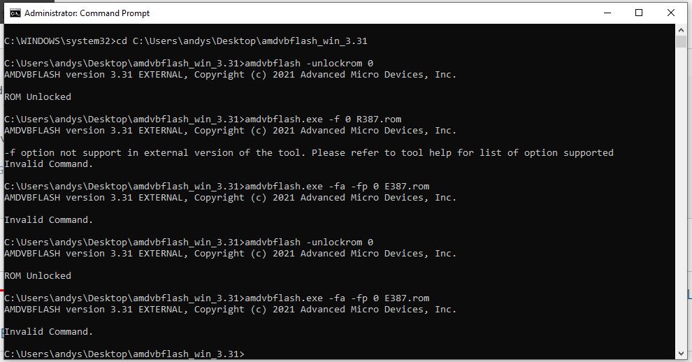 Ive tried using amdvbflashWin app to flash the matching rom, but it faild, reporting a missmatch. So I have tried (admin) cmd.exe method using amdvbflashWin -f -p 0 .rom method that is supposed to force flash, however it again reports a mismatch. Have i missed something?