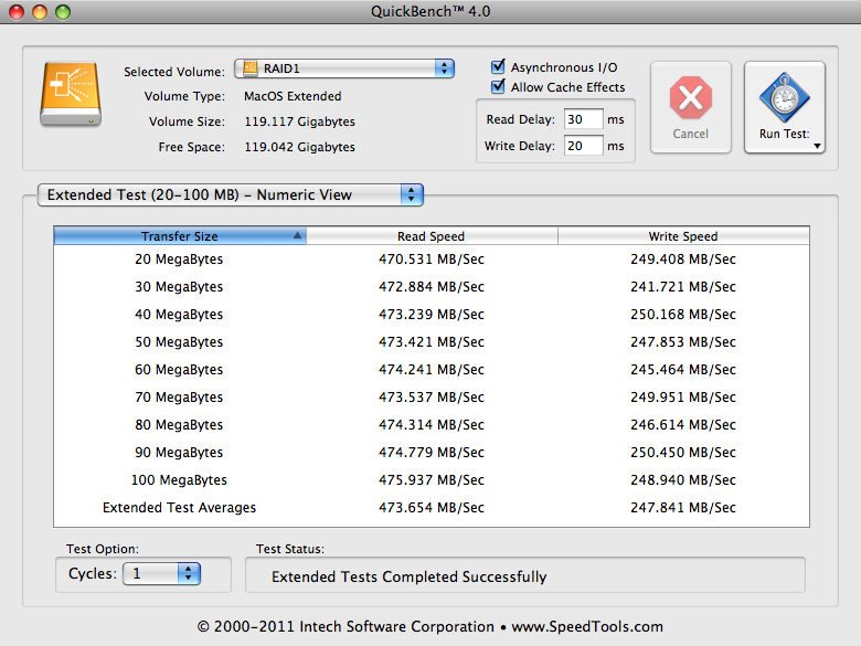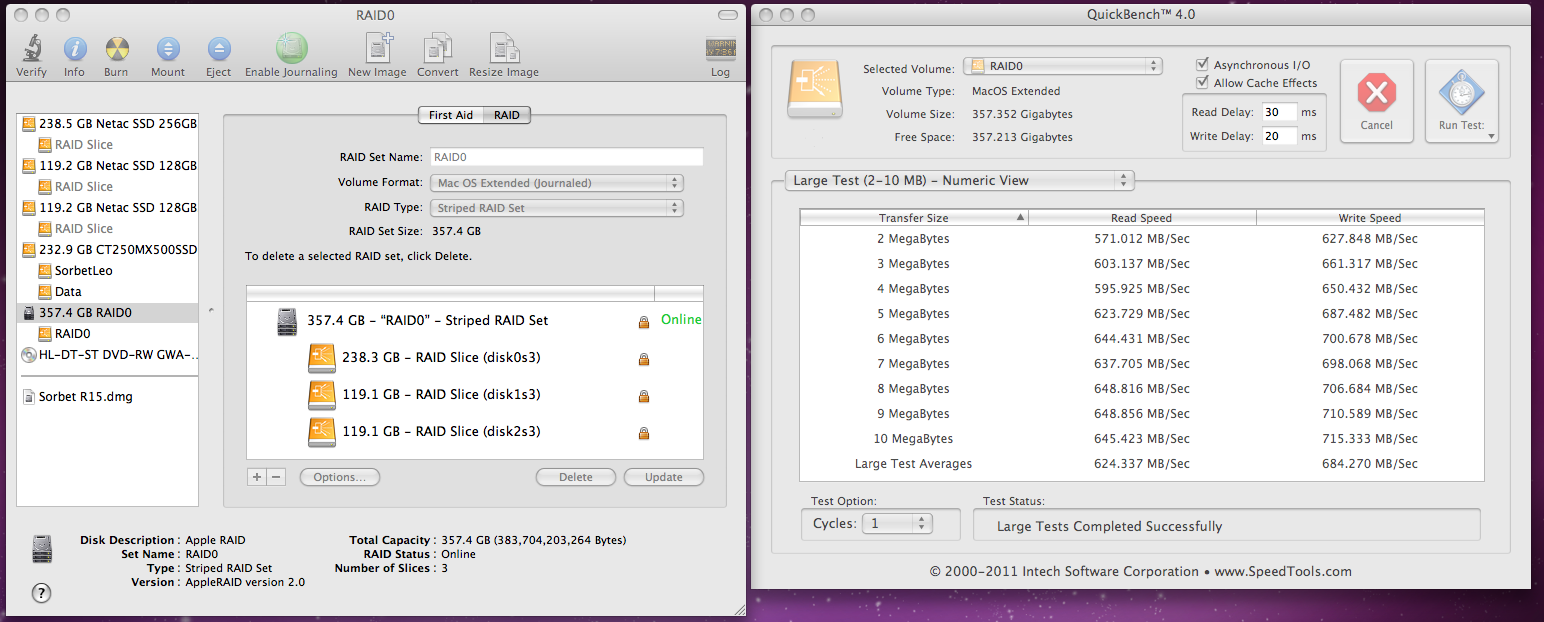 Benchmark results are one thing. Real-world transfer speeds are usually much less once CPU/file system overhead/losses are taken into account. So far, my Quad setup has proven to be capable of delivering (reliable) real-world sustained file transfers at up to 1.01 GB/s in Finder. All while booted from the actual storage itself.