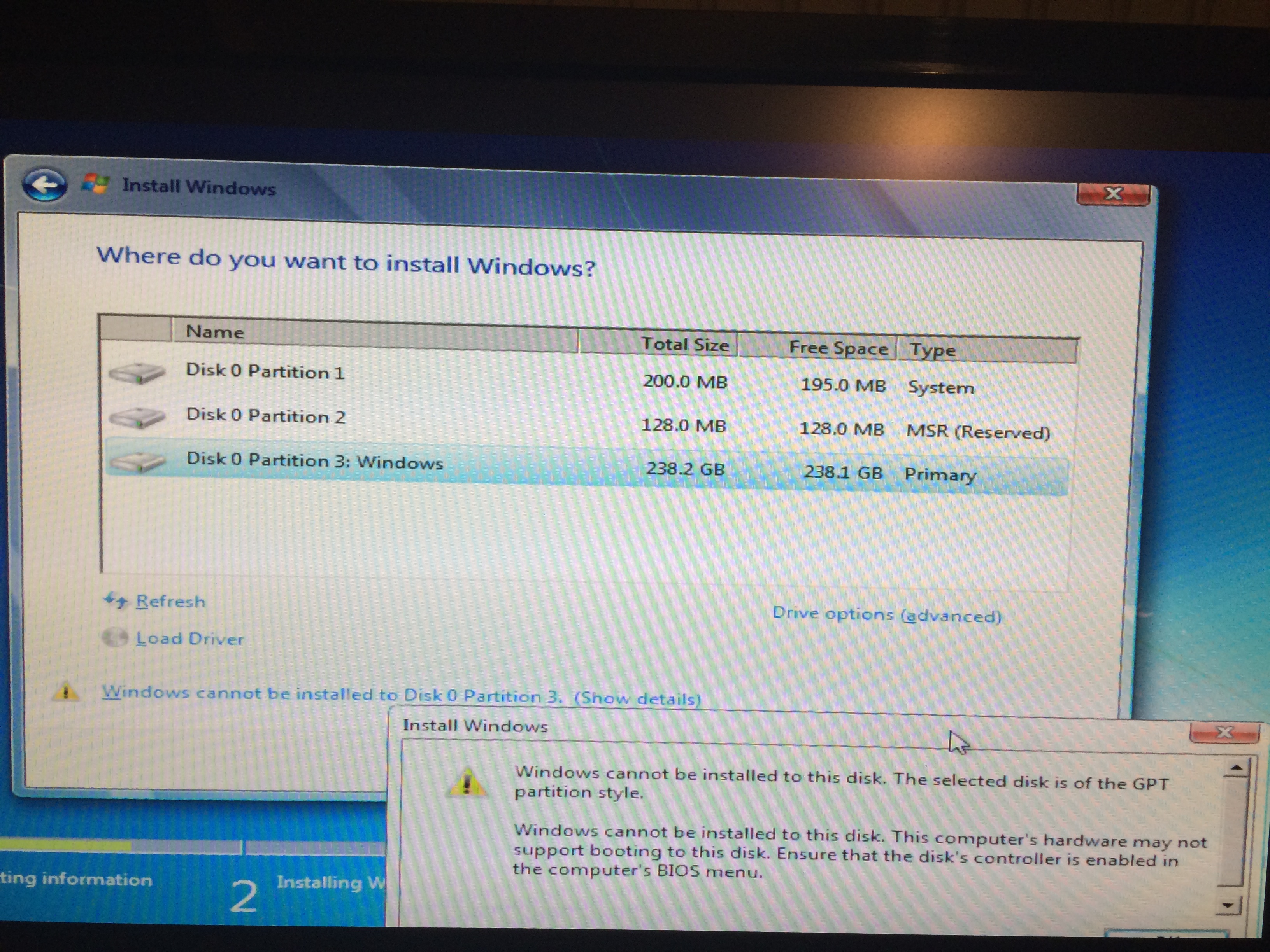 But now I'm stuck, and I have a feeling that Windows cannot install because the SM951 is being read as an external drive and cannot be booted from. In the error message, it states: "Windows cannot be installed to this disk. This computer's hardware may not support booting to this disk. Ensure that the disk's controller is enabled in the computer's BIOS menu."