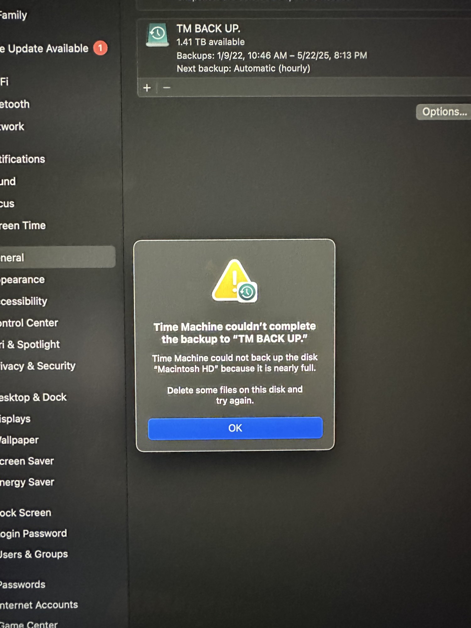 Hello. Looking for a little help here. I just started getting this pop-up on my Mac saying that I don’t have enough room for a Time Machine back up. I have an external hard drive that I use for Time Machine backups and when I check, it says I still have 1.4 TB of space, but the pop-up is saying I don’t have enough. I’m a bit confused. Any idea why it’s telling me that when I still have so much storage left on my external hard drive. I’m going to post a pic of what I see when I open up the external hard drive. It shows me back ups from 2022 up until now. Am I able to delete back ups from 2022 to 2024 with no issue to free up space? Here are a few pictures of what I’m seeing. Thanks so much for any help.