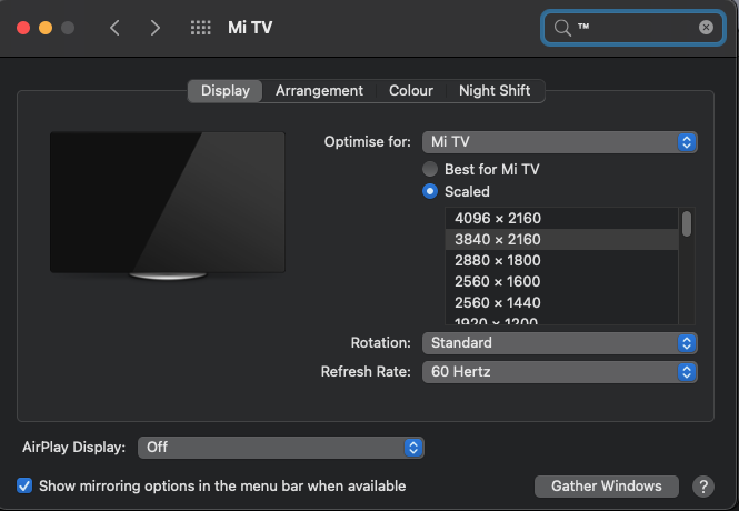 Once you've done that, press "turn video mirroring on", also in the switchres menu bar. This makes the display menu in Mac preferences behave weirdly (pictured below), but it does the trick! Obviously you can only use your external monitor, and not your internal one (they show the same thing) but who cares.