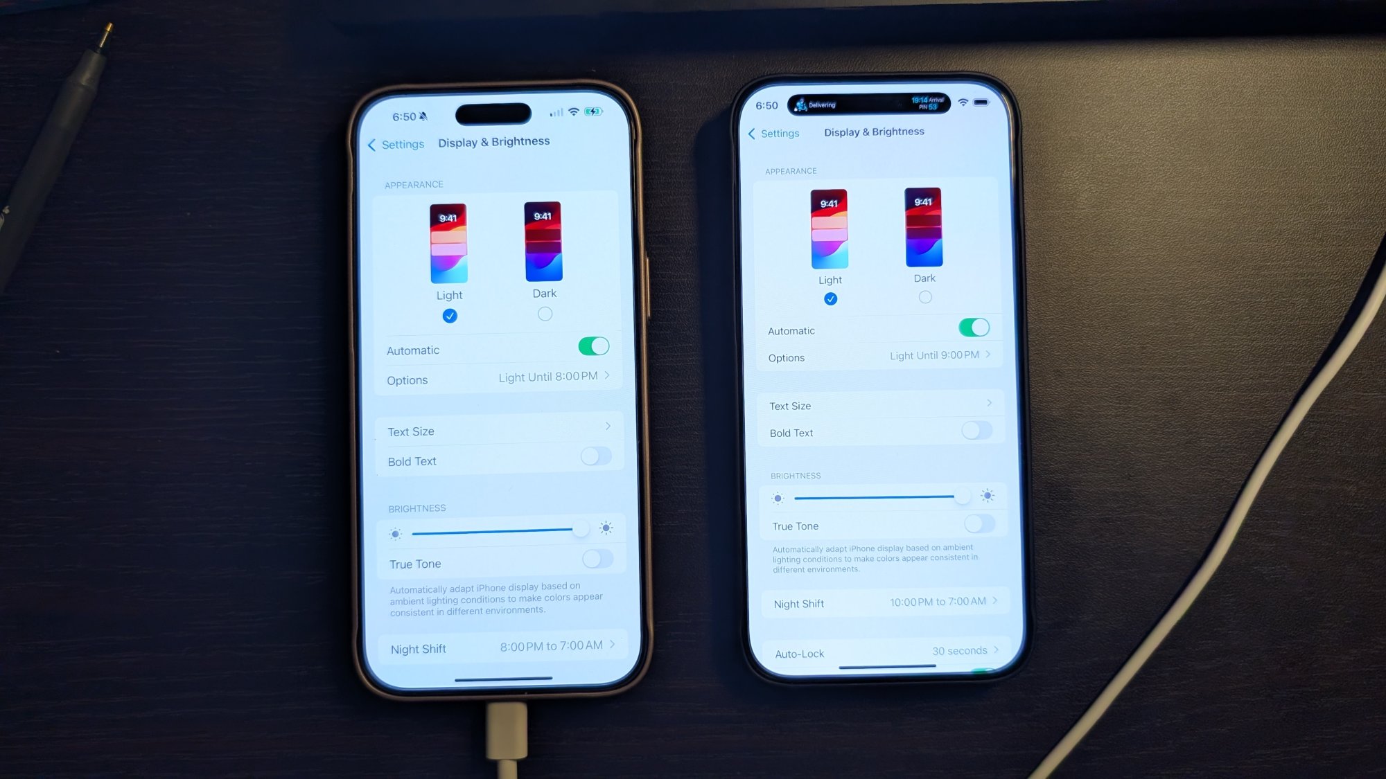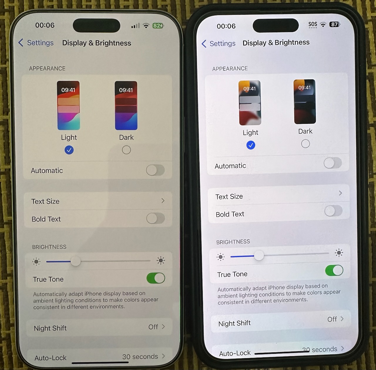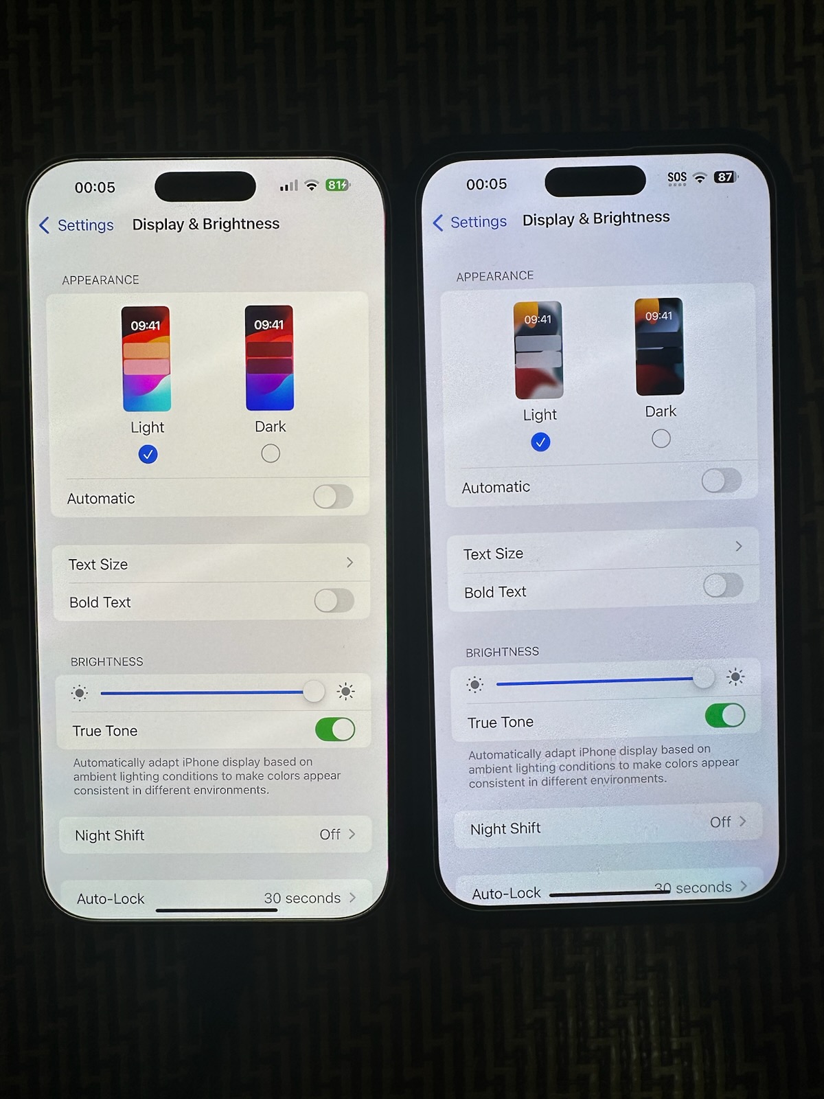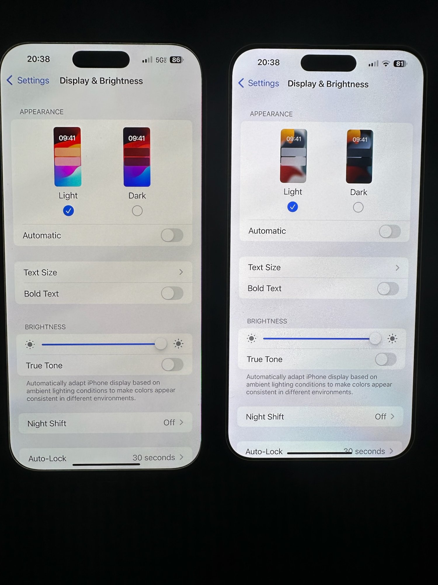 So, I set up brightness on both phones trought Siri, for more precision. True Tone off, Auto-Brightness off. Photos were taken on iPhone X.