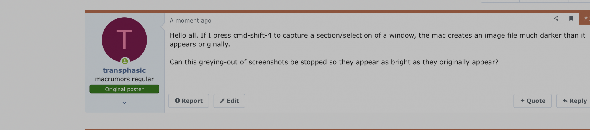 Hello all. If I press cmd-shift-4 to capture a section/selection of a window, the mac creates an image file much darker than it appears originally.