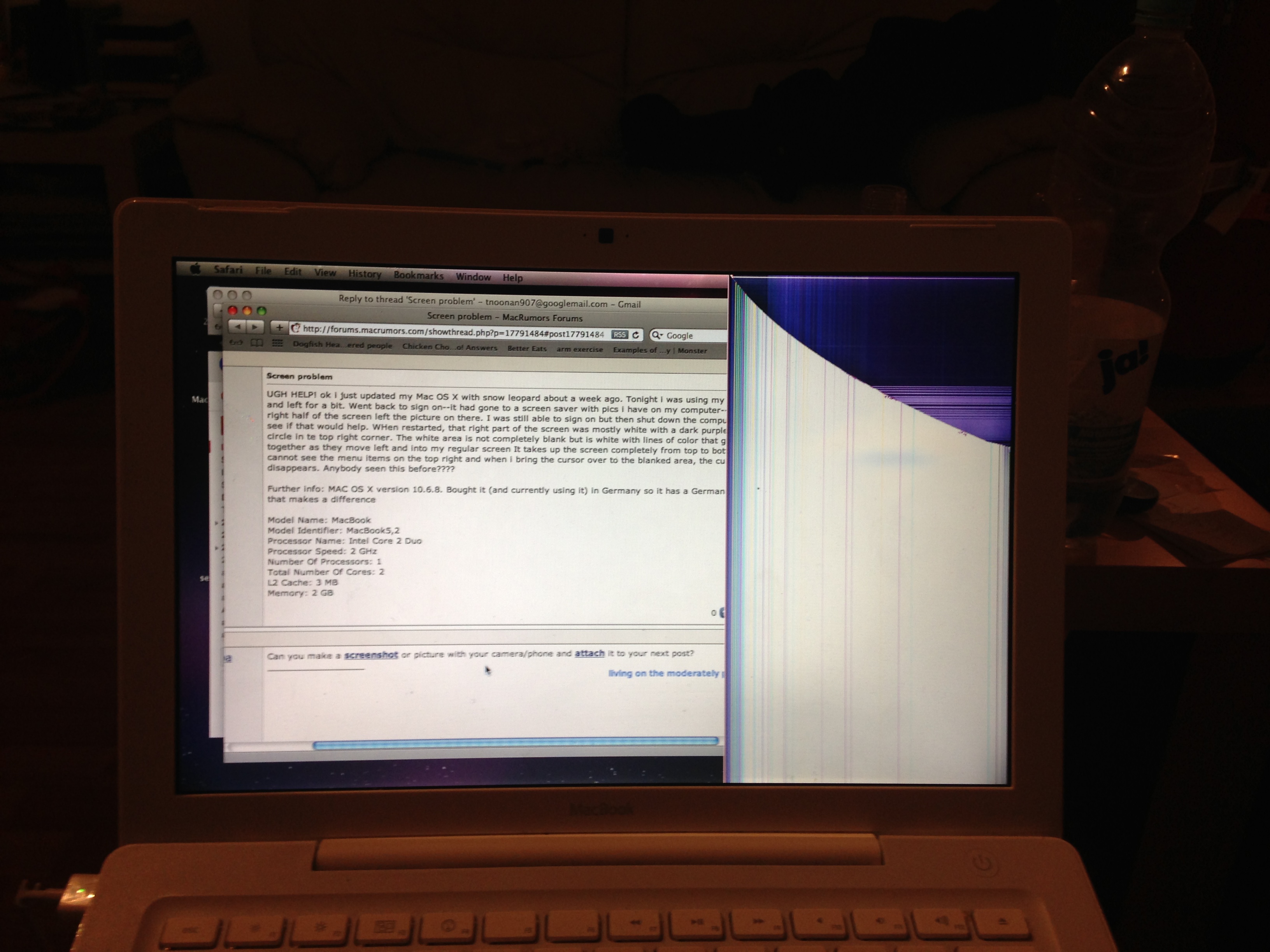 UGH HELP! ok i just updated my Mac OS X with snow leopard about a week ago. Tonight i was using my computer, and left for a bit. Went back to sign on--it had gone to a screen saver with pics i have on my computer-- and the right half of the screen left the picture on there. I was still able to sign on but then shut down the computer just to see if that would help. WHen restarted, that right part of the screen was mostly white with a dark purple quarter circle in te top right corner. The white area is not completely blank but is white with lines of color that get closer together as they move left and into my regular screen It takes up the screen completely from top to bottom so i cannot see the menu items on the top right and when i bring the cursor over to the blanked area, the curser disappears. Anybody seen this before????