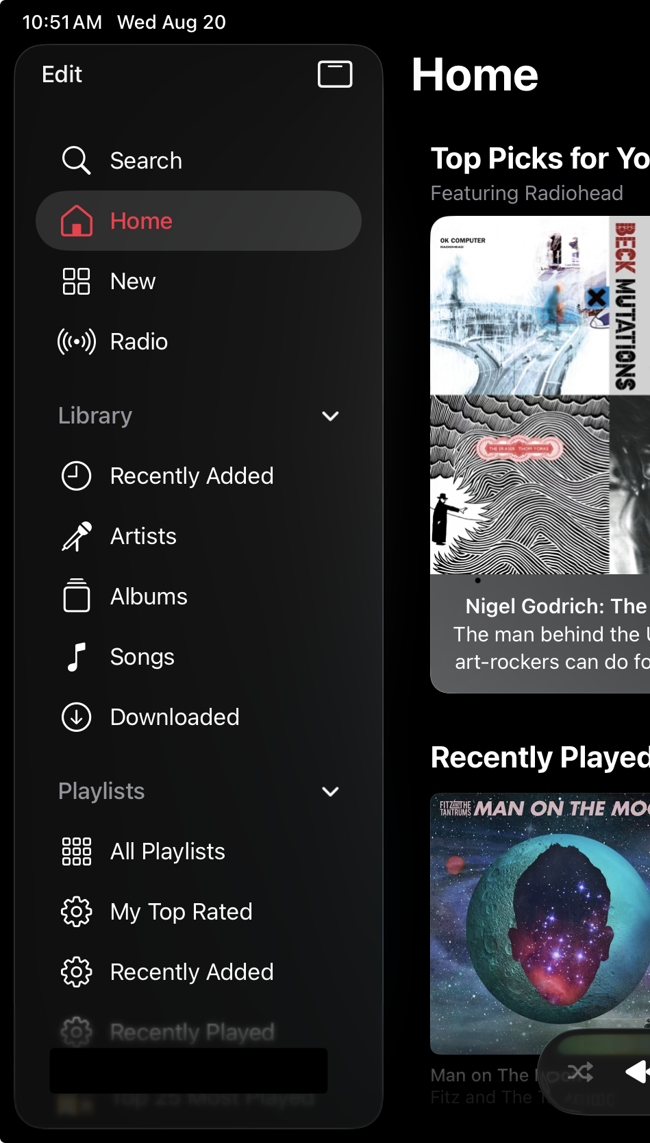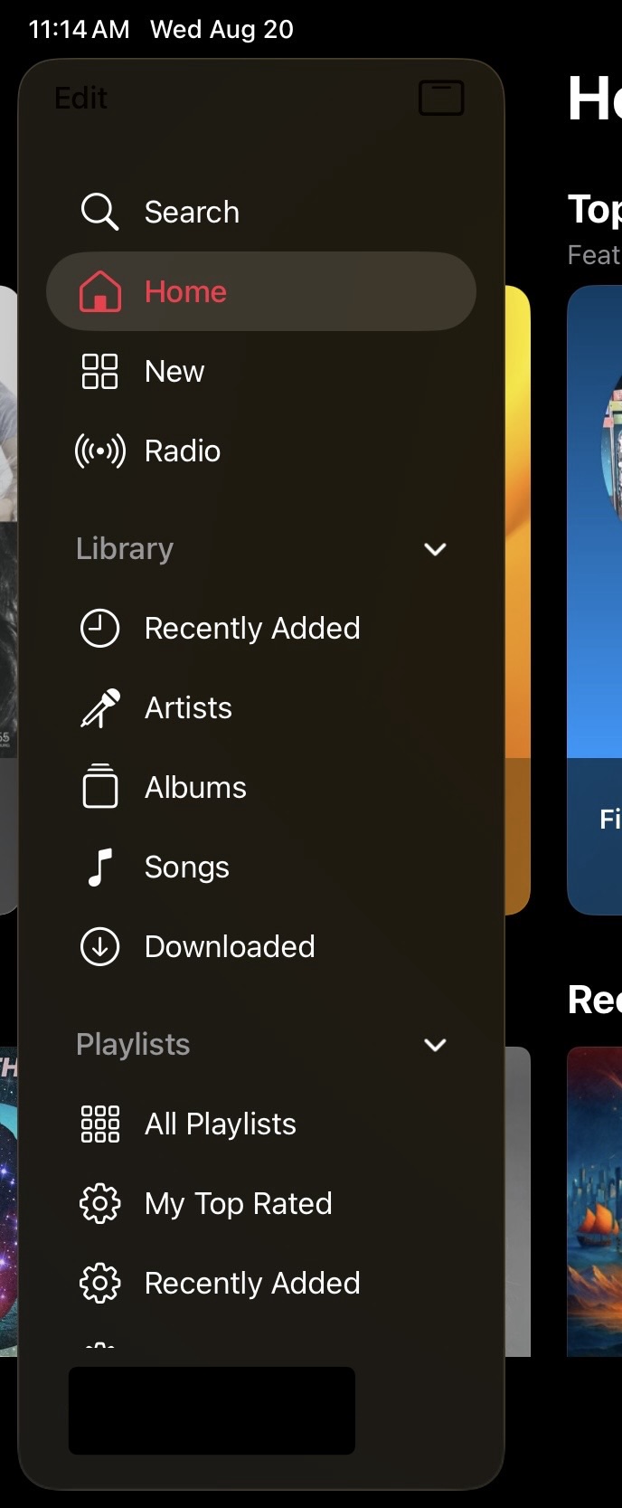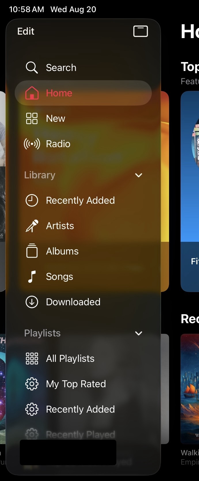Here's what the sidebar looks like when you open the Music app or go to a different screen...there's nothing behind it. I'm usually interacting with the sidebar right away, or scrolling the categories. I rarely do both at once.